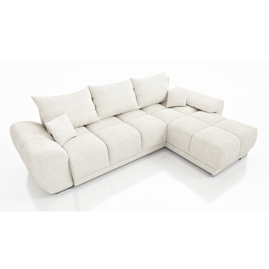 Dodatkowym atutem modnego narożnika z pojemnikiem na pościel są jego szerokie, błyszczące nóżki w srebrnym kolorze, które nadają całości nowoczesnego i eleganckiego wyglądu. W zestawie otrzymasz trzy duże poduszki oraz dwie mniejsze jaśki, które podkreślają przytulny charakter narożnika i zapewniają dodatkowy komfort.