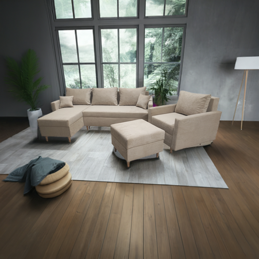 Zestaw wypoczynkowy do salonu narożnik l + pufa + fotel POJEMNIKI bonell