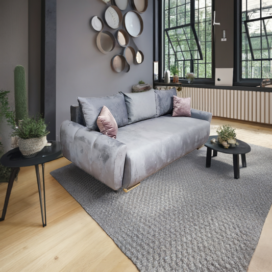 SZARA KANAPA ROZKŁADANA Z FUNKCJĄ SPANIA KODA POJEMNIK SPRĘŻYNY SOFA WELUR