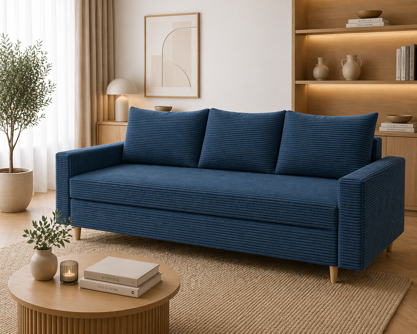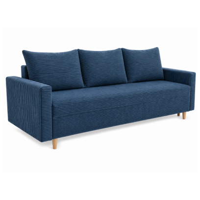 Niebieska sztruksowa sofa 210 cm z funkcja spania + pojemnik na pościel DL scandik 3