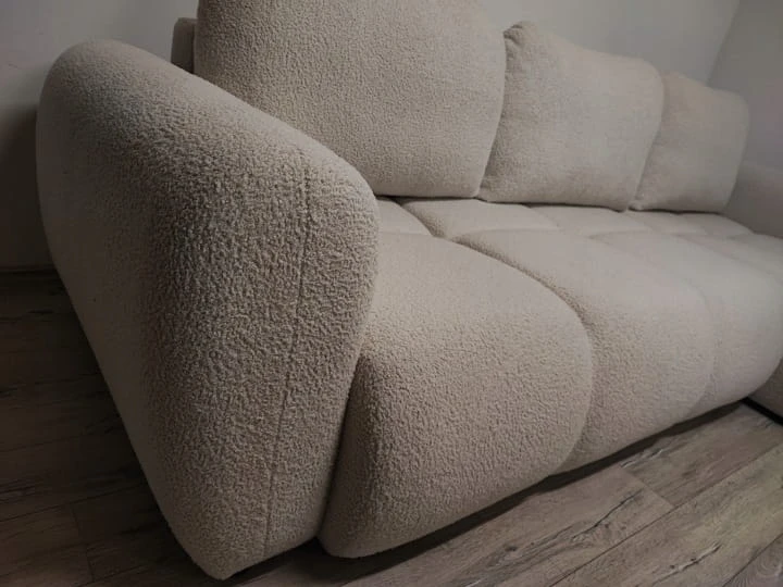Tkanina Centaur typu baranek – miękka, przyjemna w dotyku i nadająca wnętrzu ciepły, przytulny charakter. Komfort użytkowania – solidna konstrukcja, rama drewniana i sprężyny faliste zapewniają wygodę oraz trwałość. Funkcja spania – powierzchnia spania 130 x 240 cm daje dużo miejsca do odpoczynku