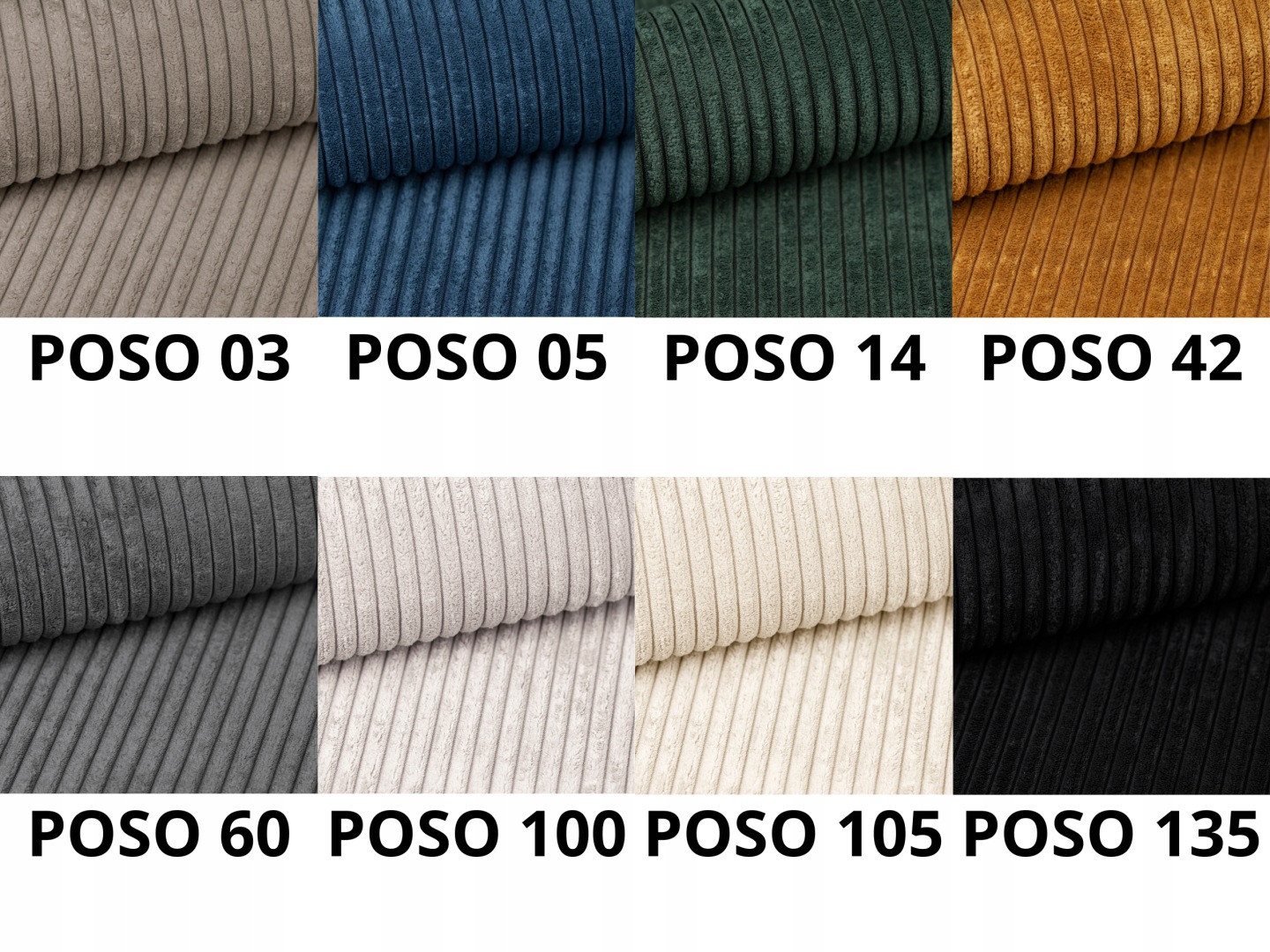 Tkanina POSO : Materiał sztruksowy, bardzo wygodny w dotyku. Gramatura tkaniny: 360g/m2. Test Martindale'a: 35 000 cykli. Tkanina o trwałośćj na palowanie.
