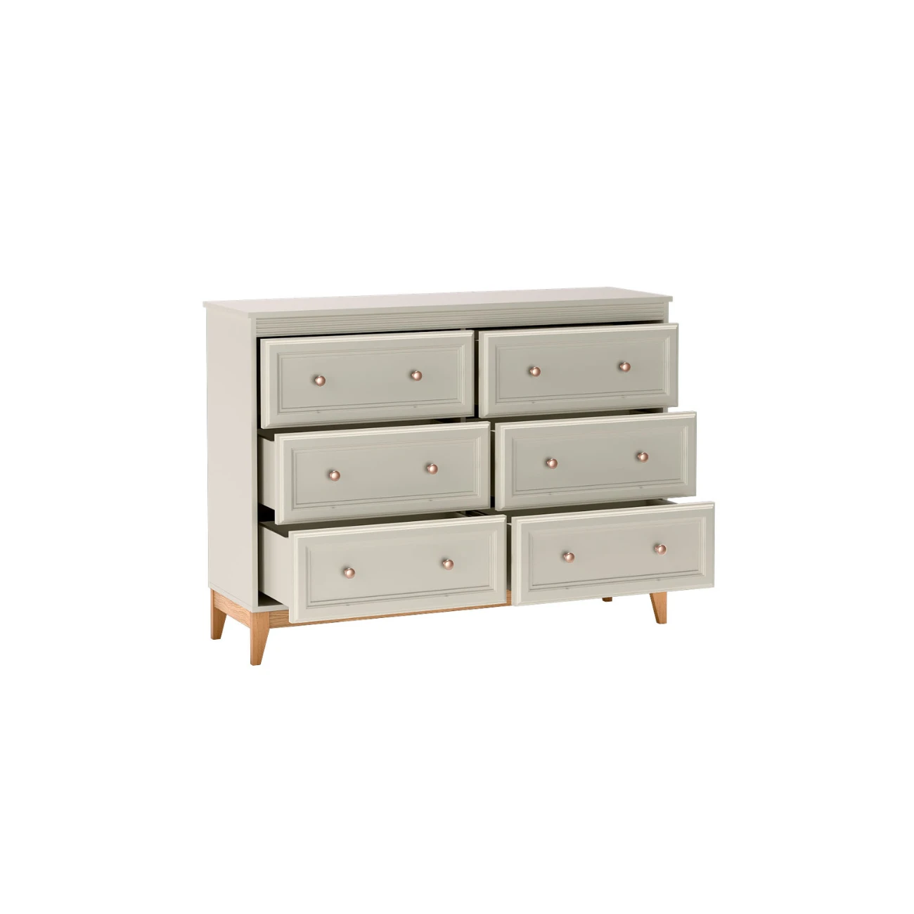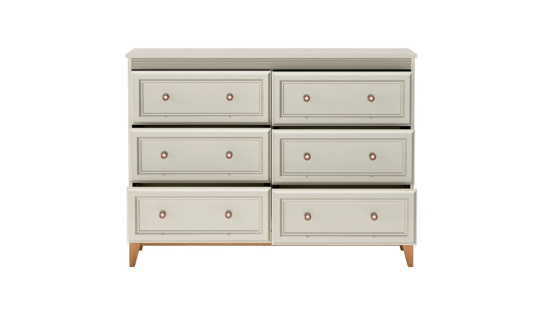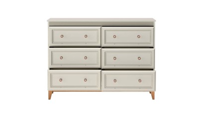 Komoda z sześcioma szufladami Buckingham to mebel, który olśniewa swoją klasą, wdziękiem oraz szykiem. Komoda została wykonana w ciepłym kolorze jakim jest kaszmir. Fronty szuflad zostały ozdobione masywnymi, metalowymi uchwytami, które podkreślają jakość komody.