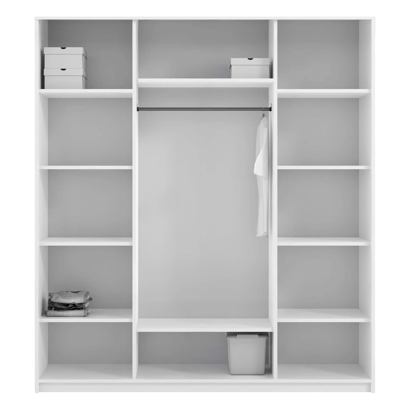 Czterodrzwiowa szafa Lille posiada aż 12 półek oraz drążek na wieszaki. 12 półek pozwoli Ci swobodnie przechowywać oraz posegregować ubrania, akcesoria modowe oraz przedmioty osobiste. Taka ilość półek pozwoli Posegregować ubrania na zimowe, letnie, wyjściowe, domowe. Dodatkowo takie wnętrze szafy pozwoli podzielić przestrzeń pomiędzy użytkowników domu.W centralnej części szafy znajduje się drążek na wieszaki. W tym miejscu możesz przechować sukienki, płaszcze czy też koszule.