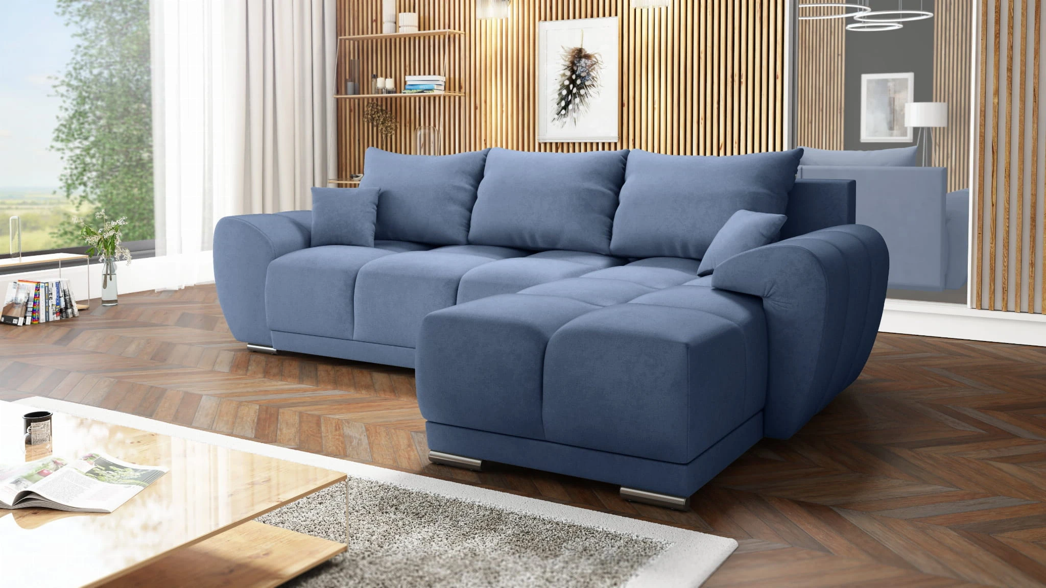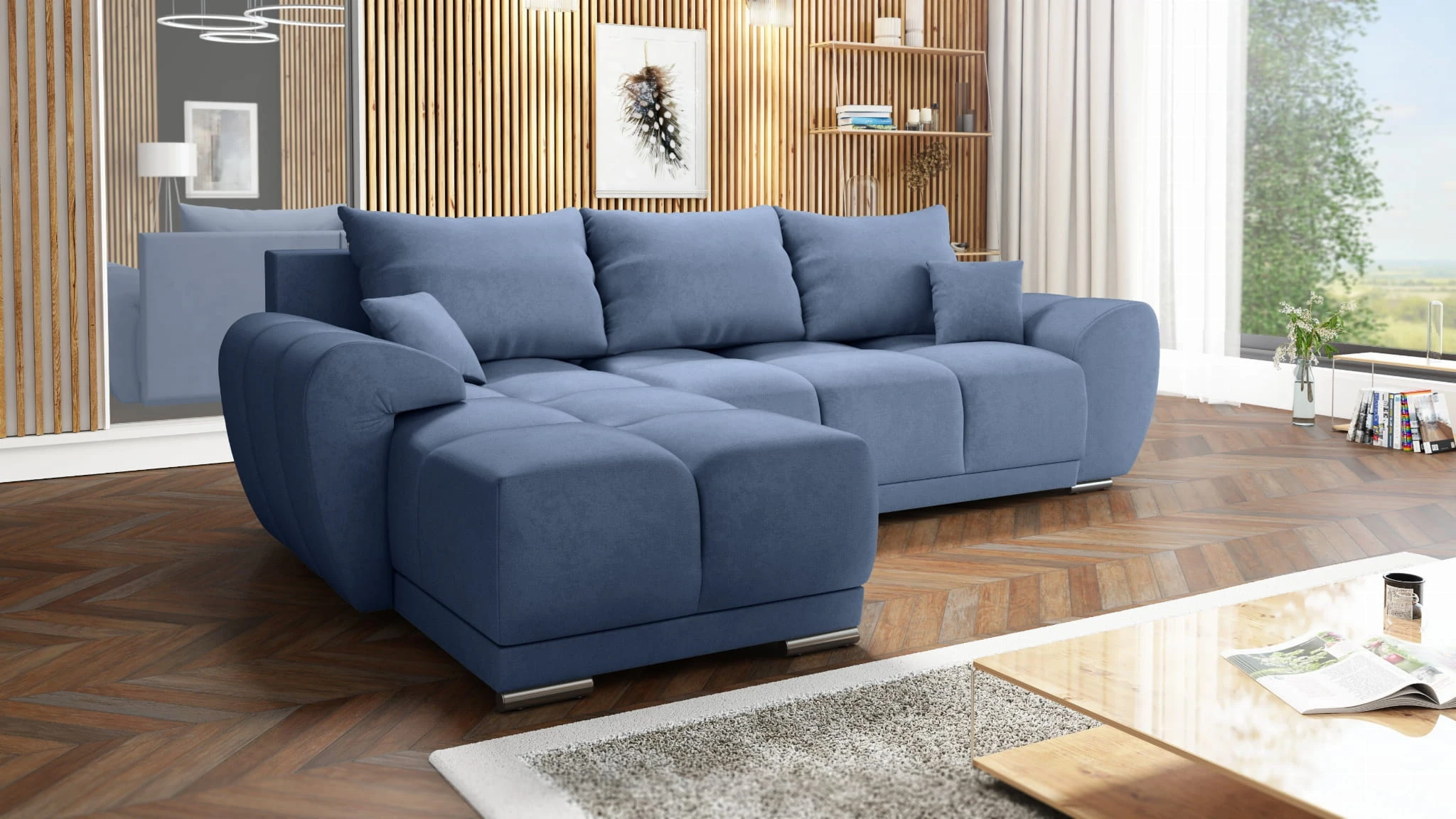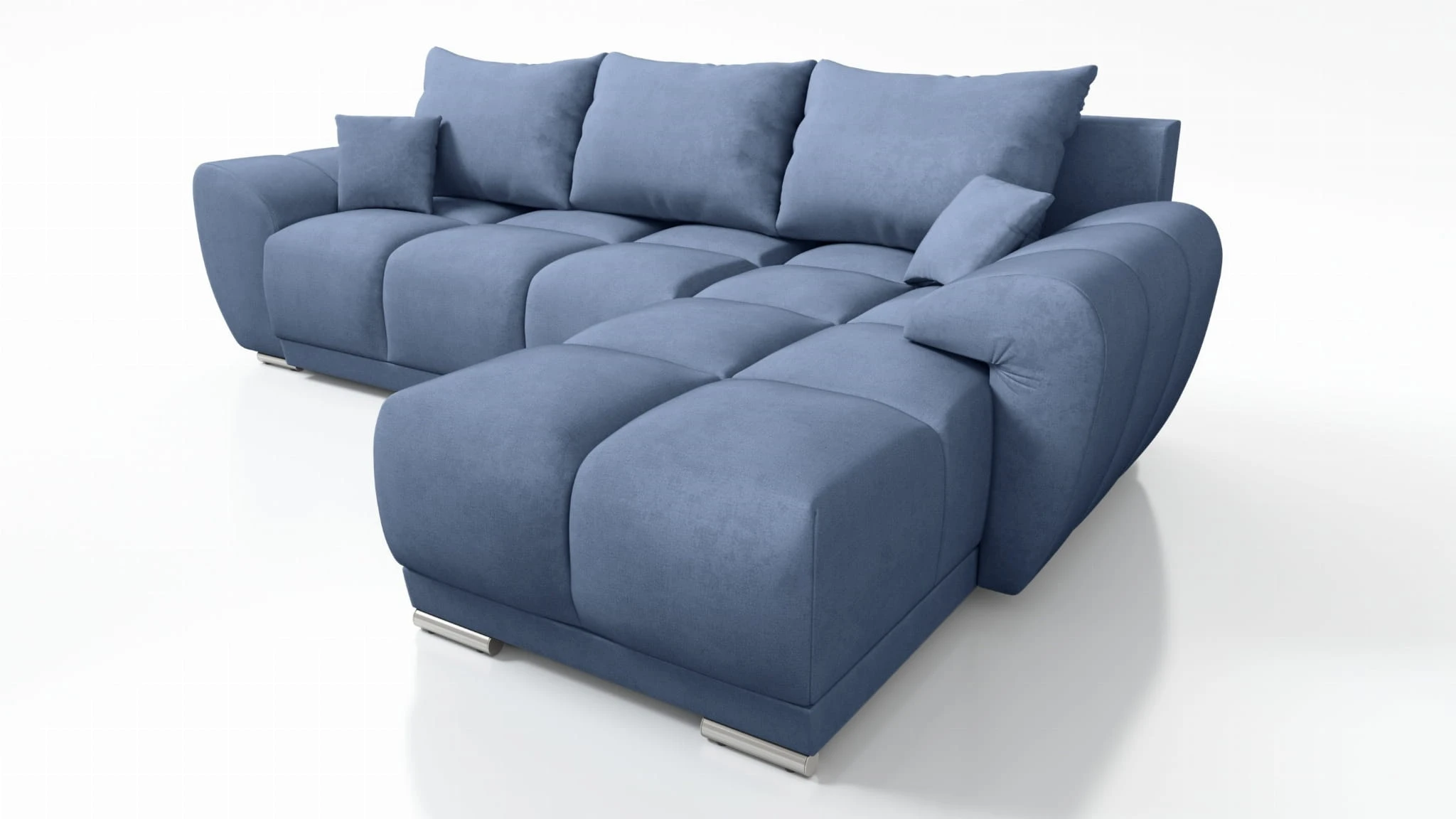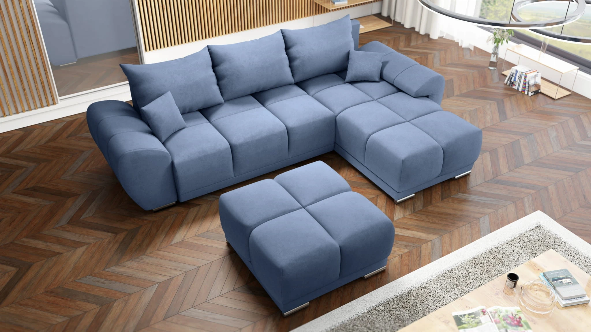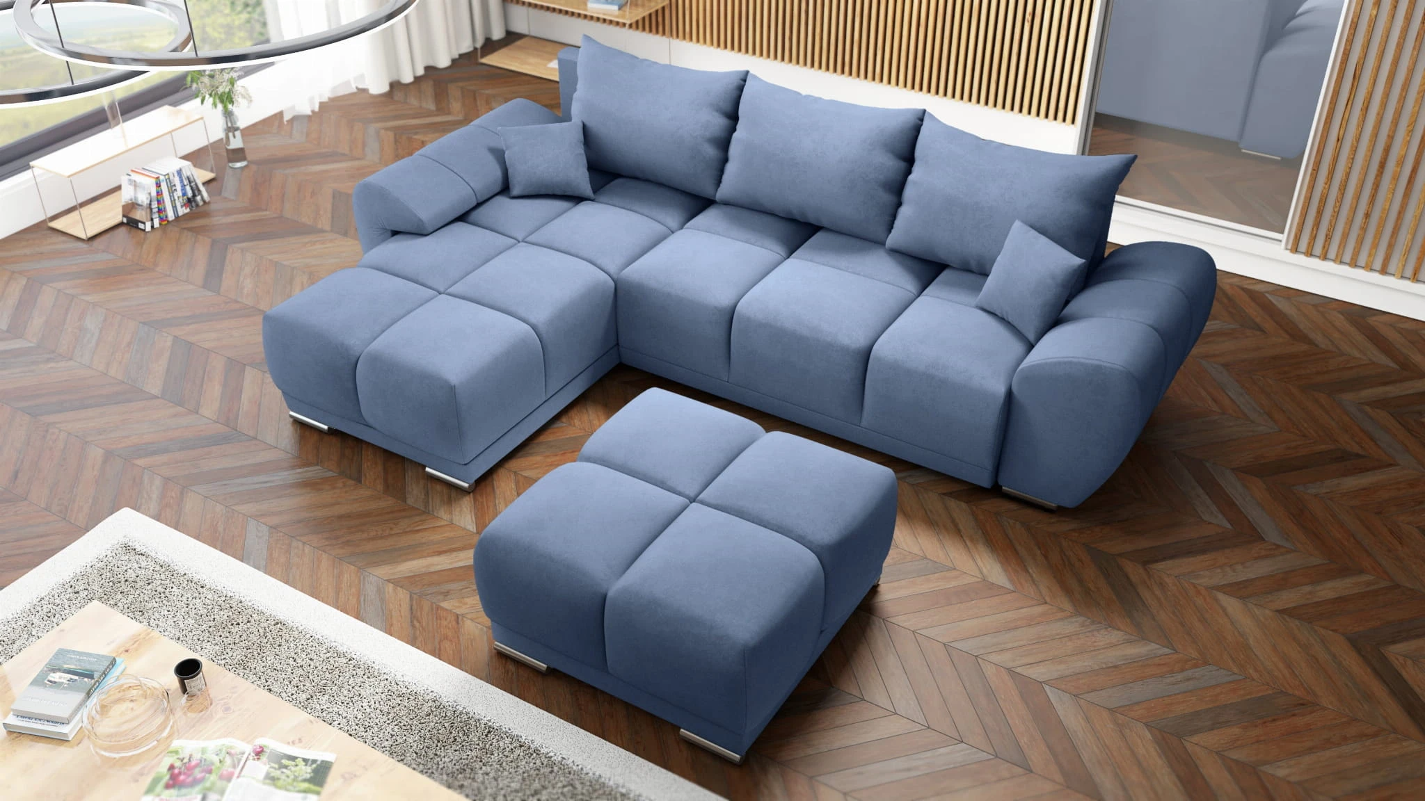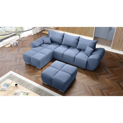 BŁĘKITNY NAROŻNIK KANAPA ROZKŁADANA Z FUNKCJĄ SPANIA HONEY L + DUŻA PUFA