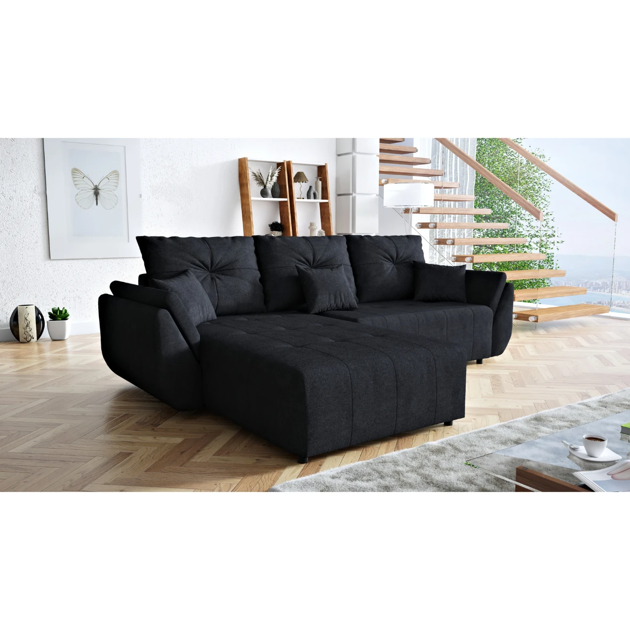 CZARNY NAROŻNIK ROZKŁADANY ROGÓWKA FUNKCJA SPANIA MIRA SPRĘŻYNY POJEMNIK
