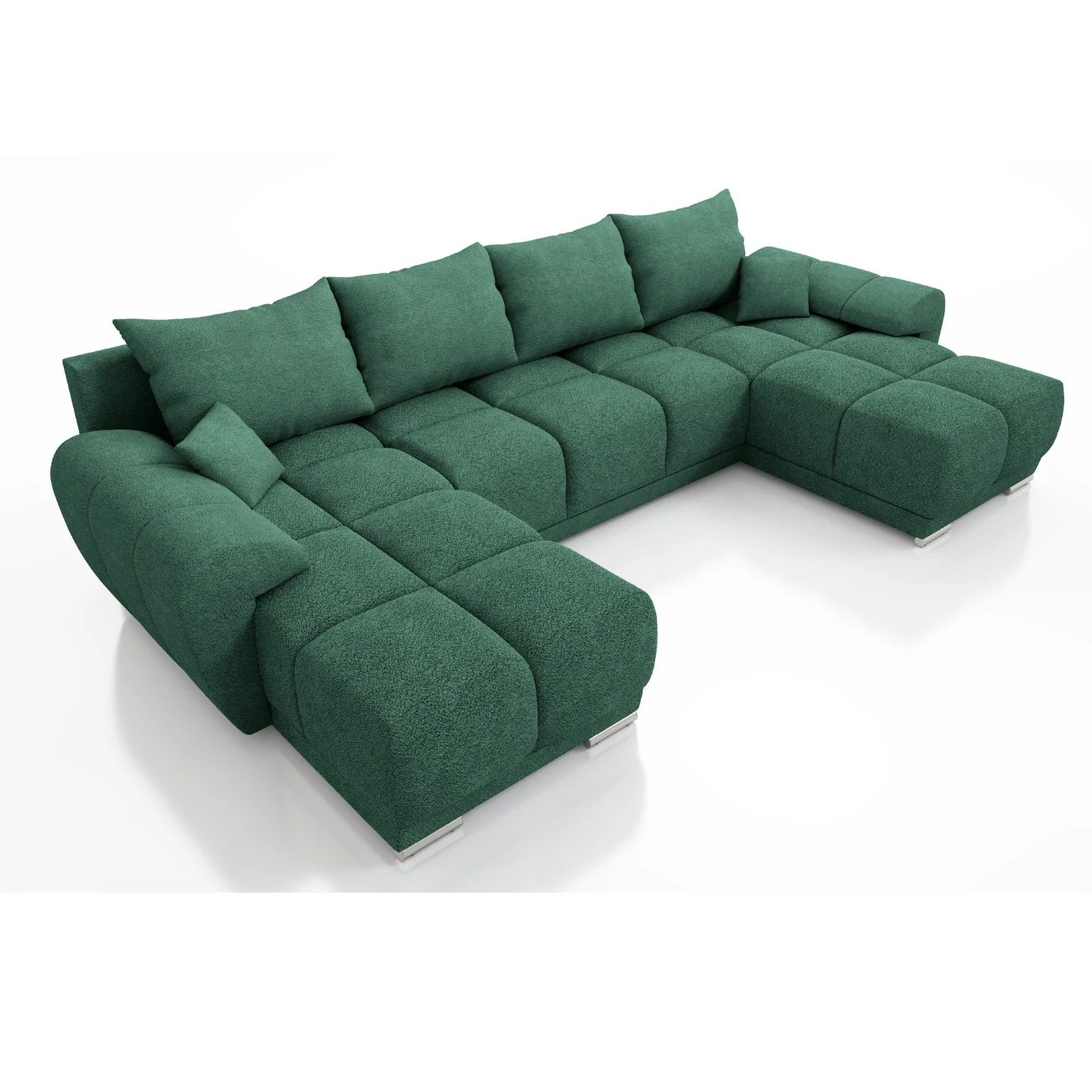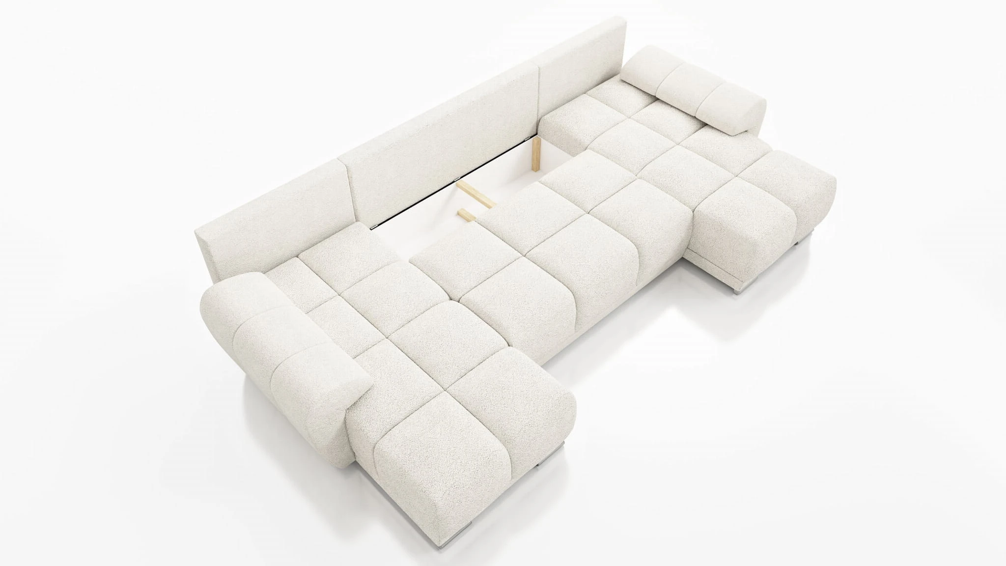 Duży narożnik w kształcie litery U został wykonany na solidnym stelażu z płyty meblowej wzmocnionej litym drewnem. Powierzchnia spania została wykonana na ramie drewnianej, do której zamocowano sprężyny faliste. Za Twój komfort wypoczynku odpowiada materac wykonany z Pianki PUR o gęstości T-30.