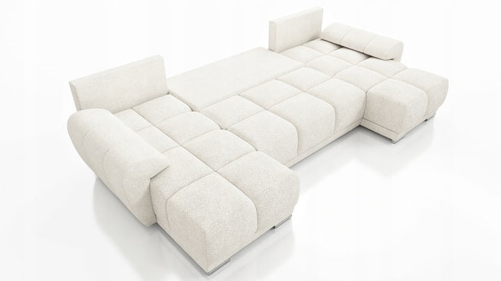 Duży narożnik w kształcie litery U został wykonany na solidnym stelażu z płyty meblowej wzmocnionej litym drewnem. Powierzchnia spania została wykonana na ramie drewnianej, do której zamocowano sprężyny faliste. Za Twój komfort wypoczynku odpowiada materac wykonany z Pianki PUR o gęstości T-30.