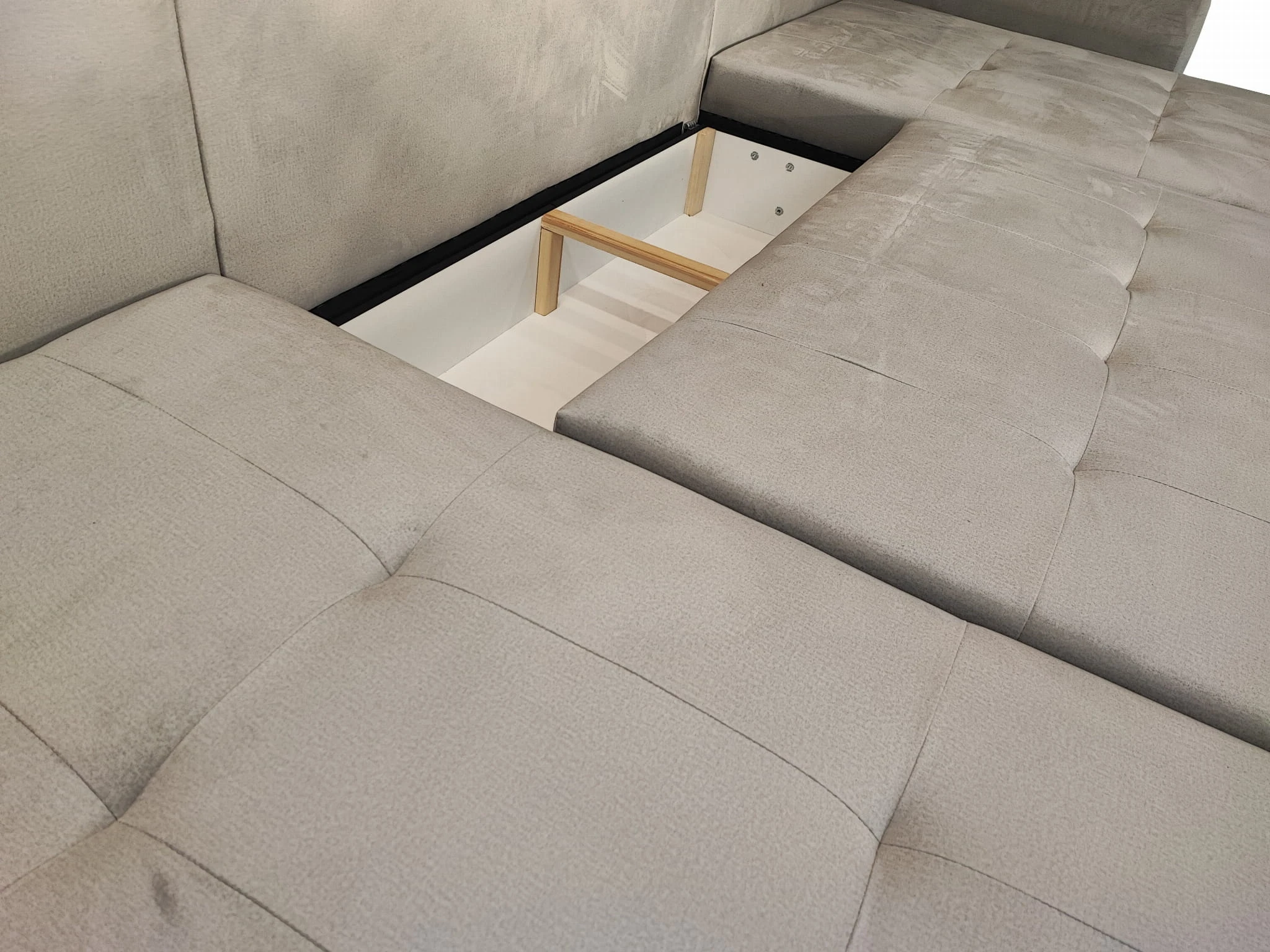 Narożnik z funkcją spania Mira posiada niezwykle trwały szkielet oparty na płycie meblowej oraz licznymi wstawkami z litego drewna. Dodatkowo otomana oraz wysuwany najazd posiada funkcję spania wykonaną na ramie drewnianej.