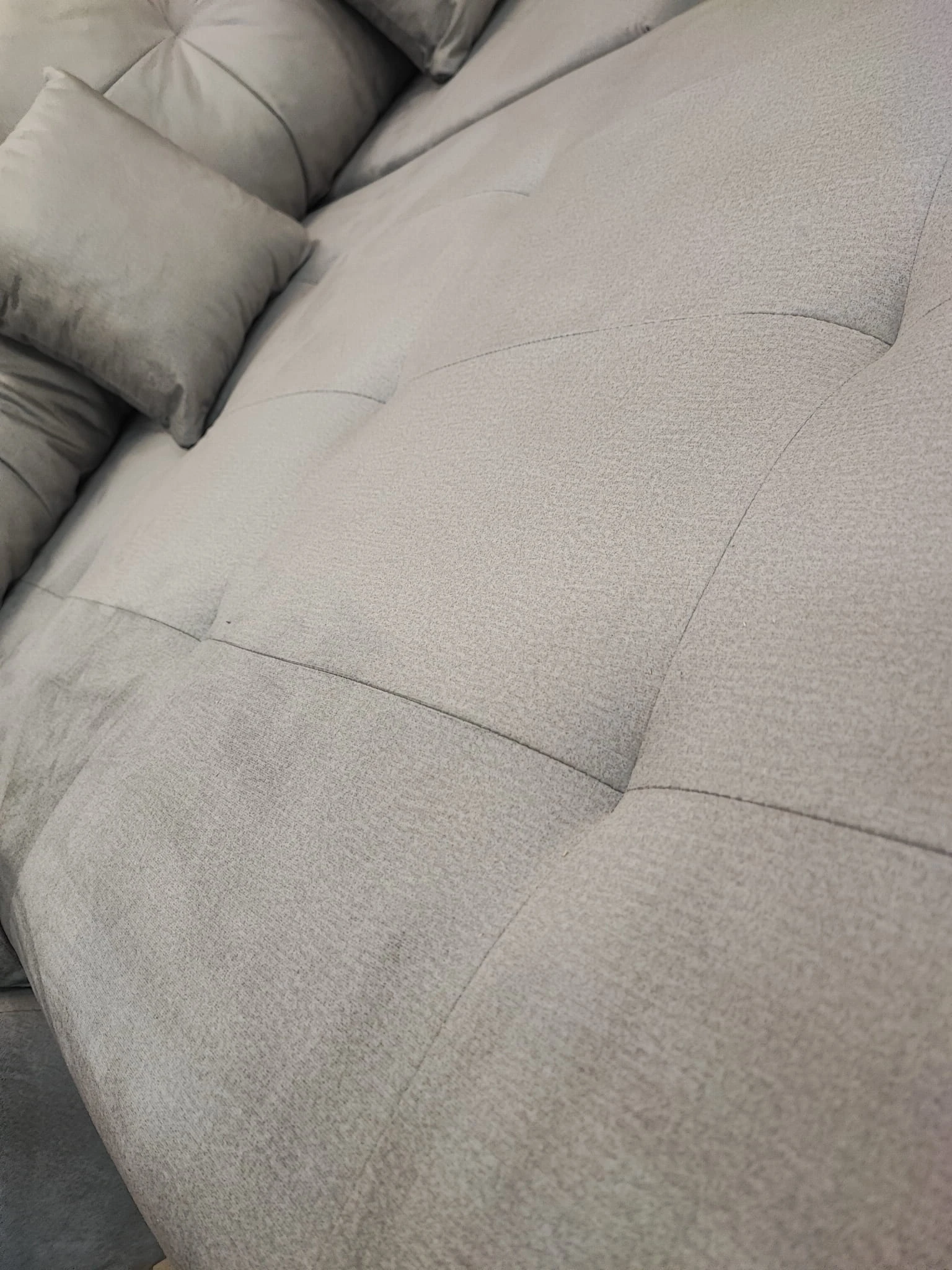 Rogówka Mira posiada liczne pikowania na siedziskach oraz poduszkach. Szczególnie wzór na poduszkach zwraca na siebie uwagę. W końcu nazwa narożnika "Mira" oznacza z hiszpańskiego "spójrz" - sugeruje coś co przyciąga wzrok.