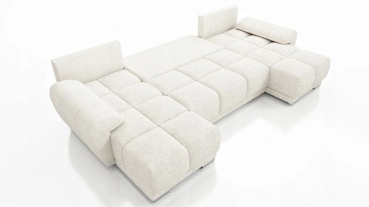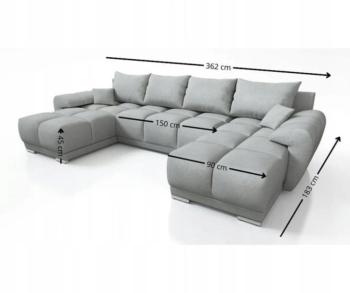 Duży narożnik w kształcie litery U został wykonany na solidnym stelażu z płyty meblowej wzmocnionej litym drewnem. Powierzchnia spania została wykonana na ramie drewnianej, do której zamocowano sprężyny faliste. Za Twój komfort wypoczynku odpowiada materac wykonany z Pianki PUR o gęstości T-30.