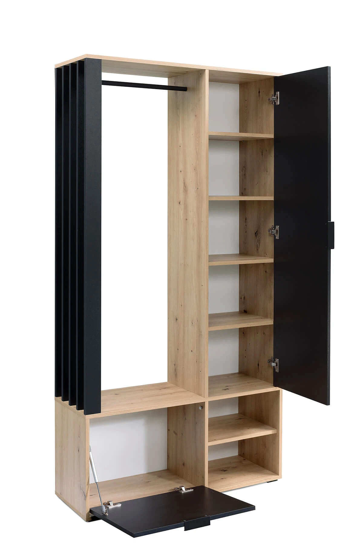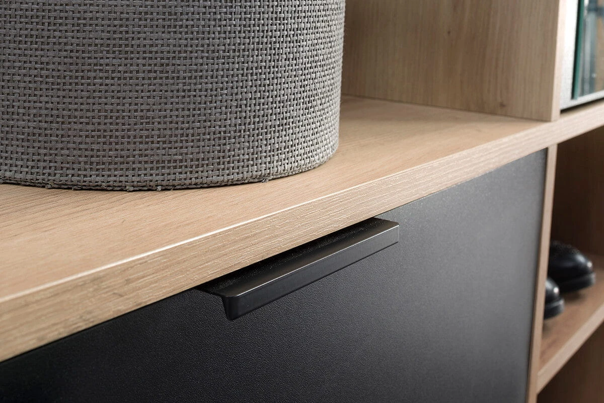 Pierwsza półka jest zamykana z przeznaczeniem na buty. Znajduje się ona w części z lamelami oraz wieszakiem na ubrania. Kolejne dwie to otwarte półki znajdujące się pod lustrzanym frontem. Za uchylnymi drzwiami nowoczesnej garderoby Haga znajdziesz aż pięć półek na ubrania, kapelusze czy akcesoria modowe. Nowoczesna garderoba Haga jest w stanie pomieścić więcej niż sądzisz!