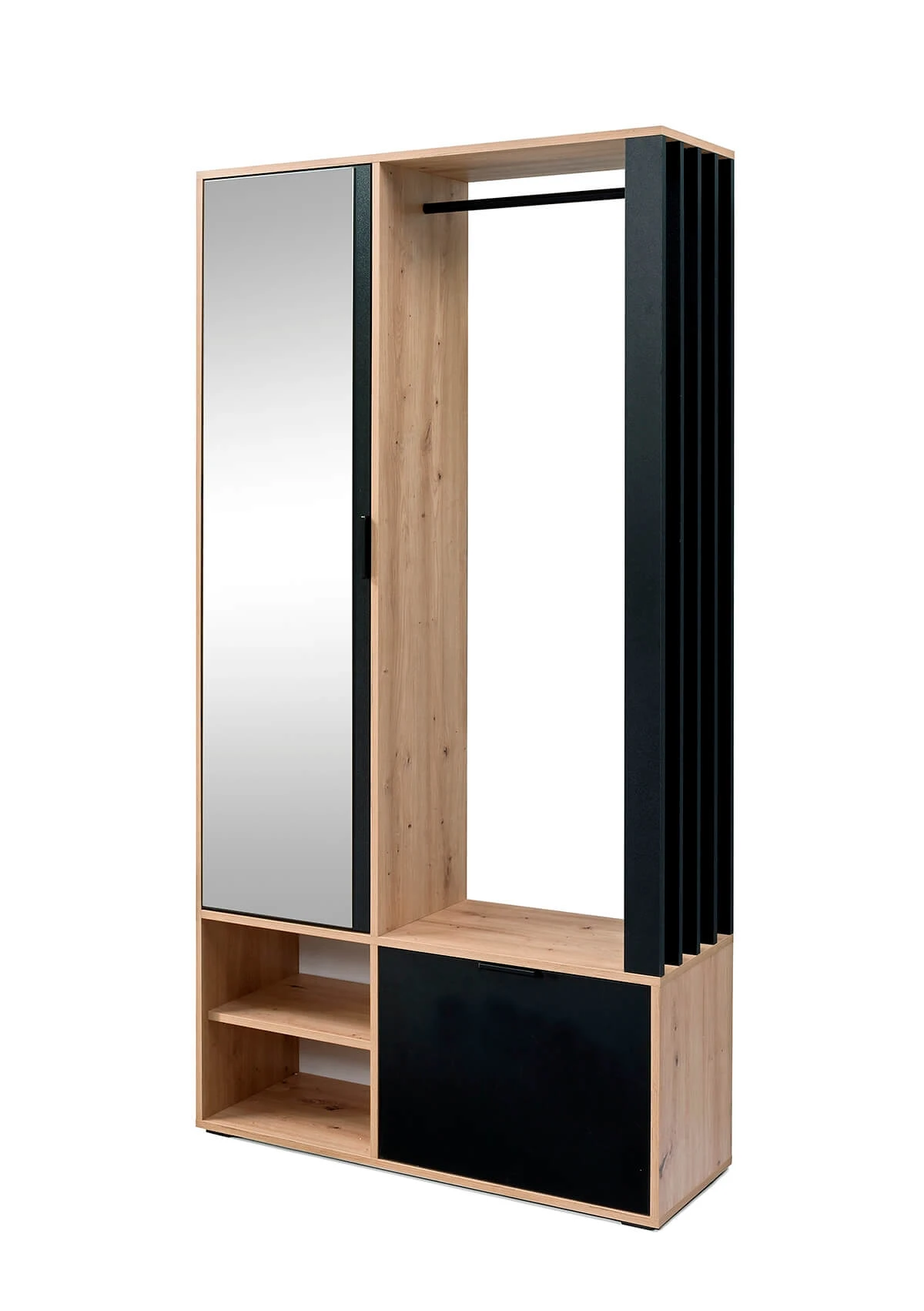 Garderoba do przedpokoju Haga została wykonana w nowoczesnym stylu industrialnym. Garderoba z lustrem Haga sprawdzi się w nowoczesnych pomieszczeniach, lecz dla sympatyków klasycznych stylów został przygotowany wariant w całości w kolorze dąb artisan.