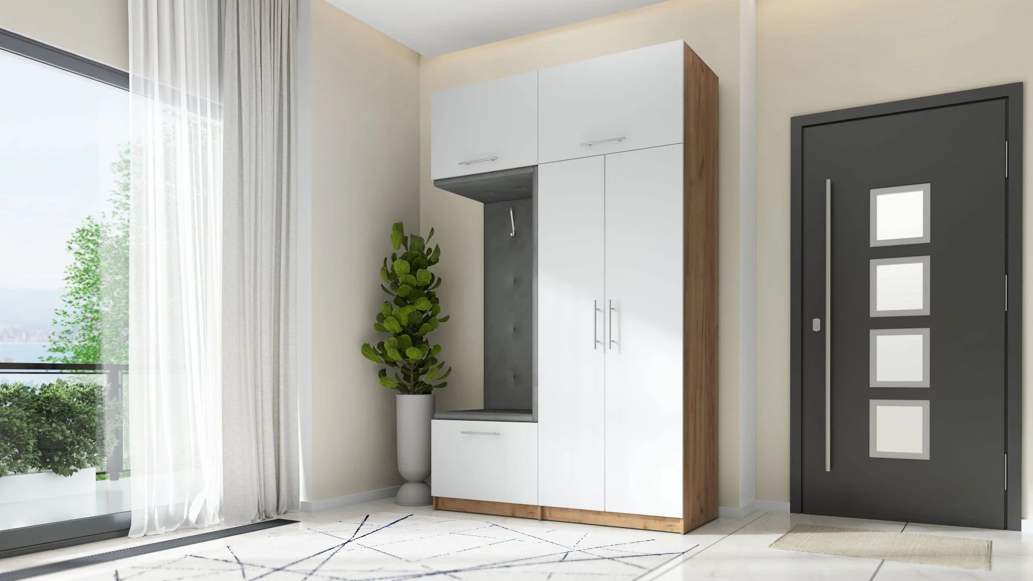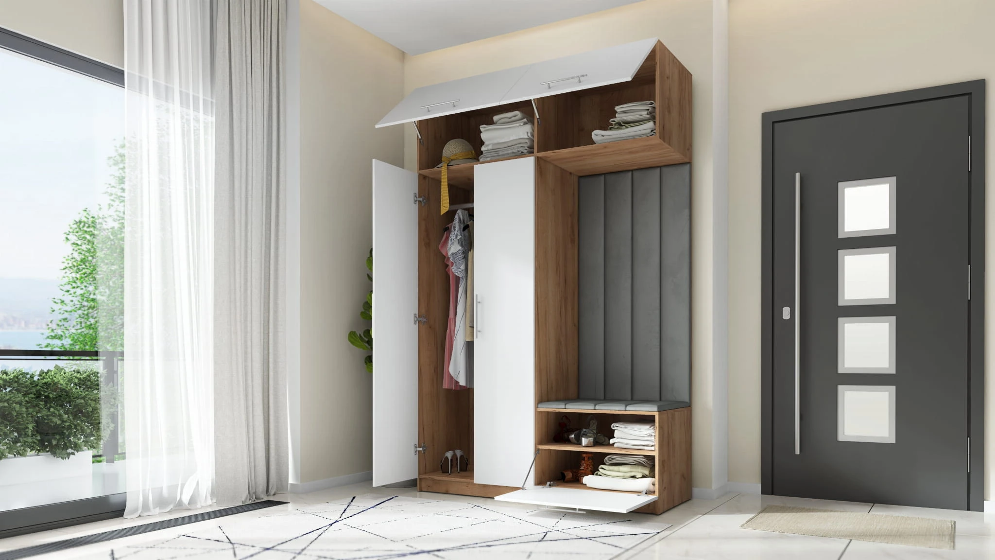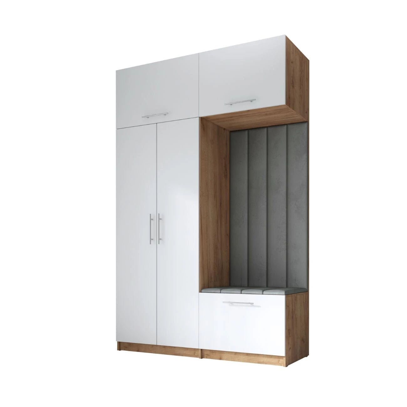 Nowoczesna garderoba do przedpokoju składa się z dwóch części: po lewej stronie znajduje się dwudrzwiowa szafa z nadstawką. Za podwójnym frontem znajduje się drążek na wieszaki, który pomieści nawet najdłuższe płaszcze. Nadstawka posiada front podnoszony do góry z siłownikami ułatwiającymi otwarcie nadstawki. Szeroka półka umożliwi przechowanie walizek podróżnych czy nawet pościeli.