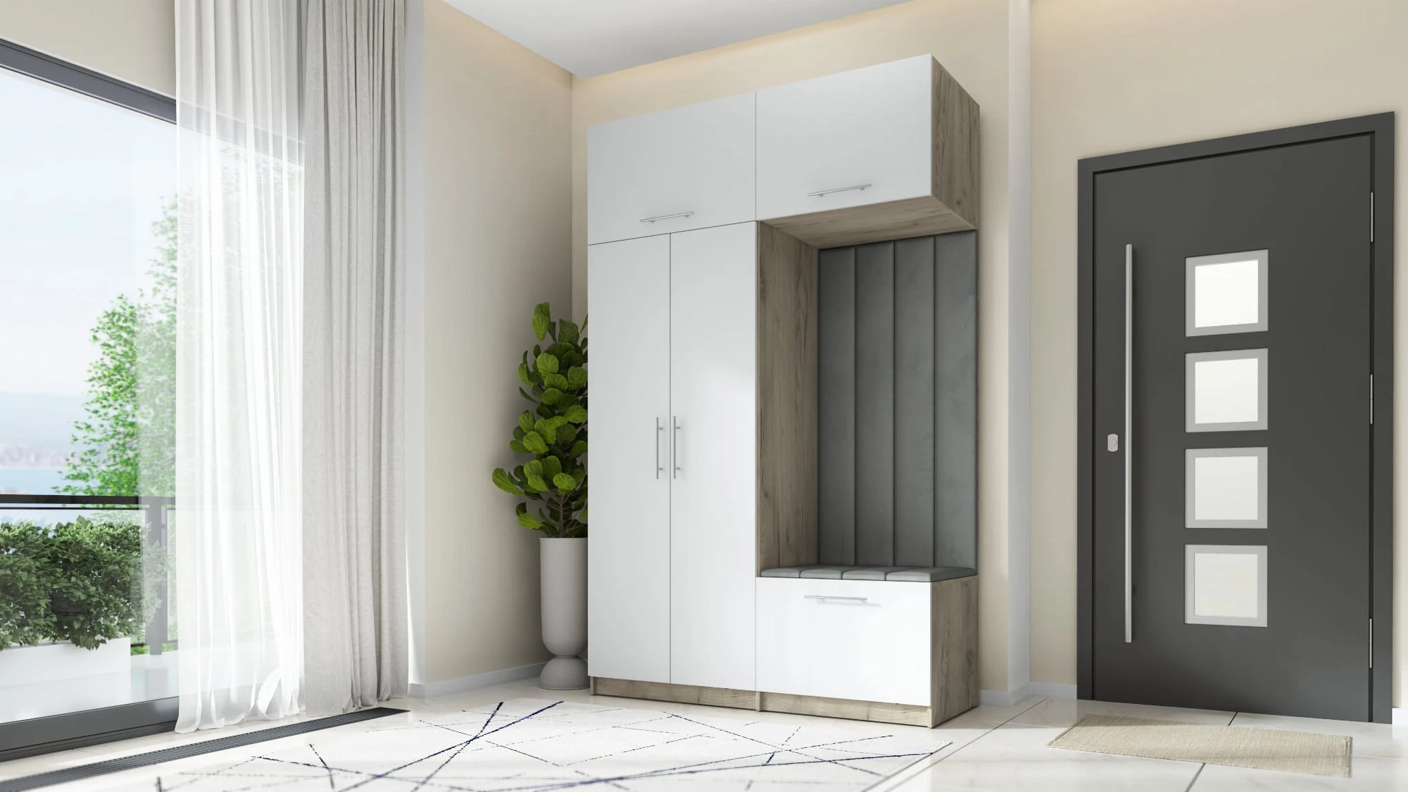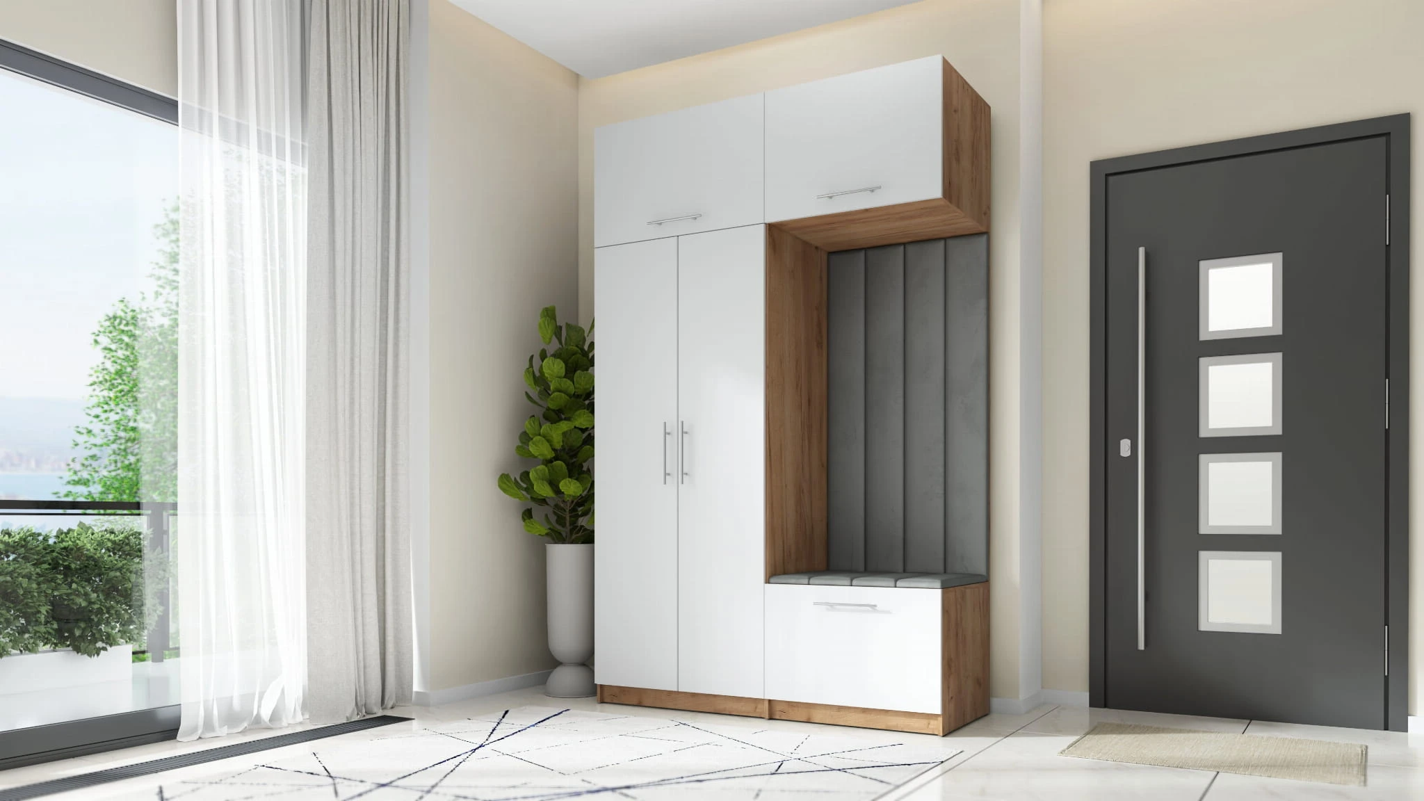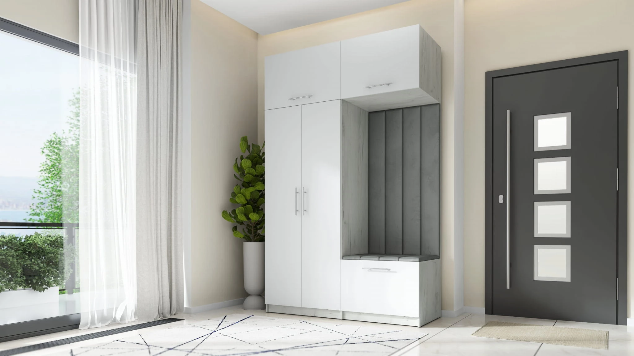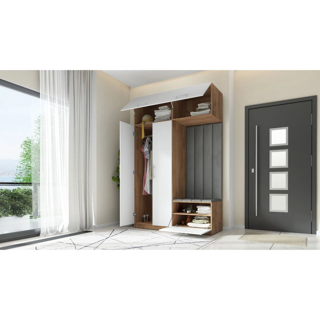 Nowoczesna garderoba do przedpokoju składa się z dwóch części: po lewej stronie znajduje się dwudrzwiowa szafa z nadstawką. Za podwójnym frontem znajduje się drążek na wieszaki, który pomieści nawet najdłuższe płaszcze. Nadstawka posiada front podnoszony do góry z siłownikami ułatwiającymi otwarcie nadstawki. Szeroka półka umożliwi przechowanie walizek podróżnych czy nawet pościeli.