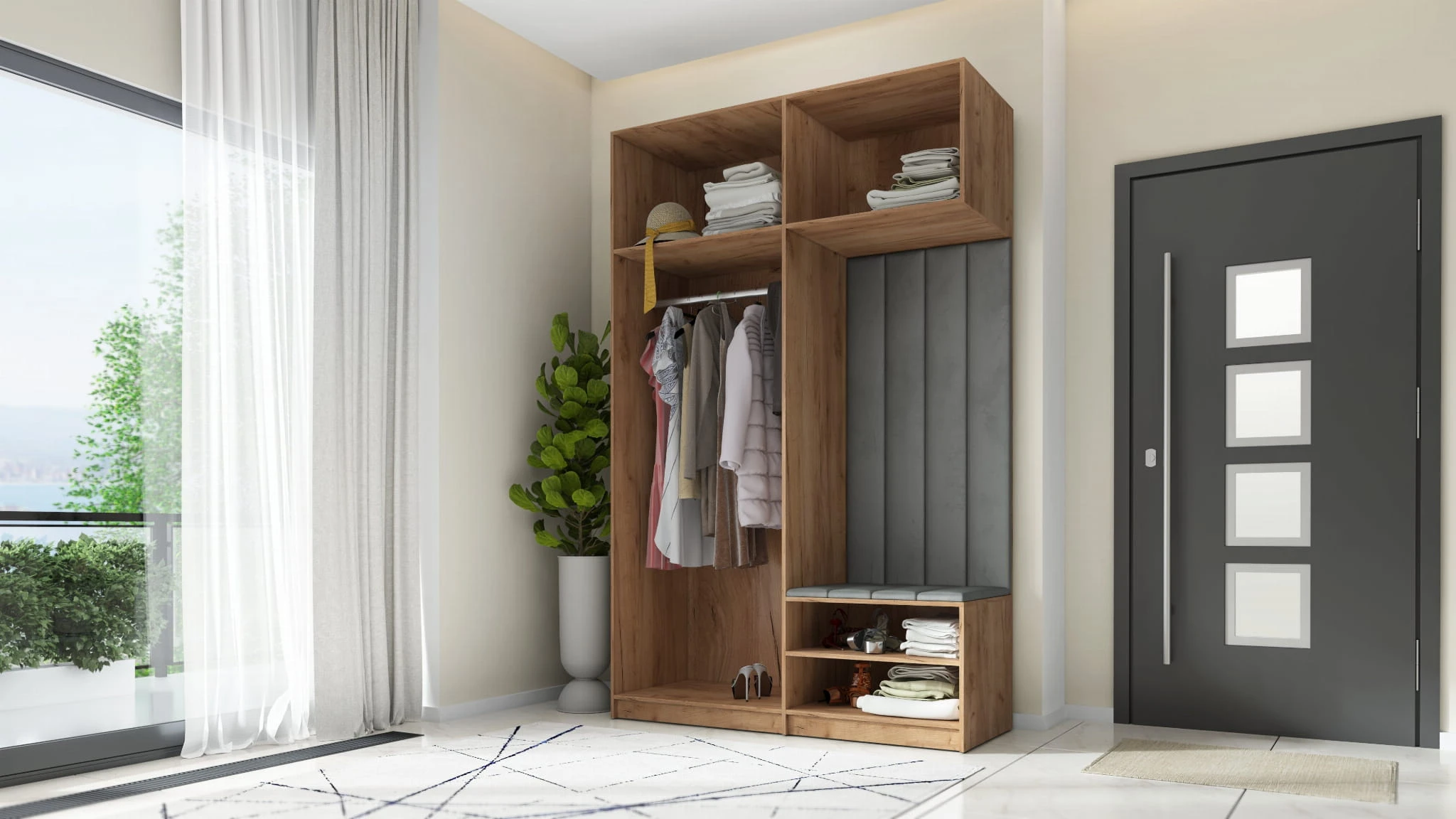 Prawa strona to oczywiście tapicerowana wnęka z siedziskiem wykonana w hydrofobowej tkaninie Monolith 84. Szara tapicerka świetnie łączy się z każdą kolorystyką szafy, a welurowy materiał jest przyjemny w dotyku. Pod siedziskiem znajdują się cztery półki, które idealnie sprawdzą się jako szafka na buty. Nad tapicerowaną wnęką znajduje się kolejna nadstawka z wnętrzem przedzielonym na pół.