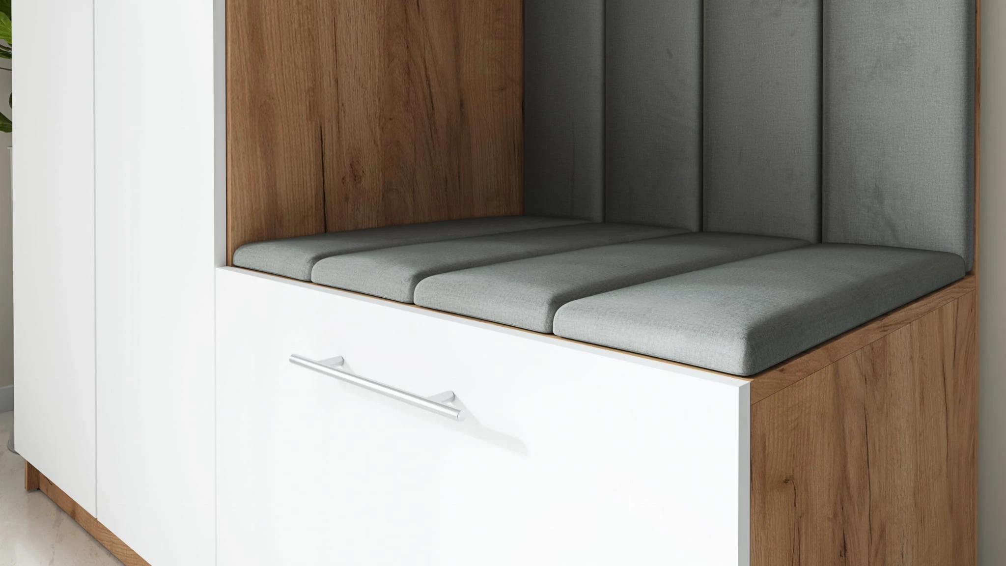 Tapicerowana wnęka z siedziskiem to wygodne miejsce do ubrania butów. Siedzisko w garderobie jest szczególnie przydatne dla osób starszych oraz dzieci. Dodatkowo z pewnością przyda się Twoim gościom, który po obfitym poczęstunku będą mogli założyć obuwie bez konieczności schylania sie i kucania z pełnym brzuchem.