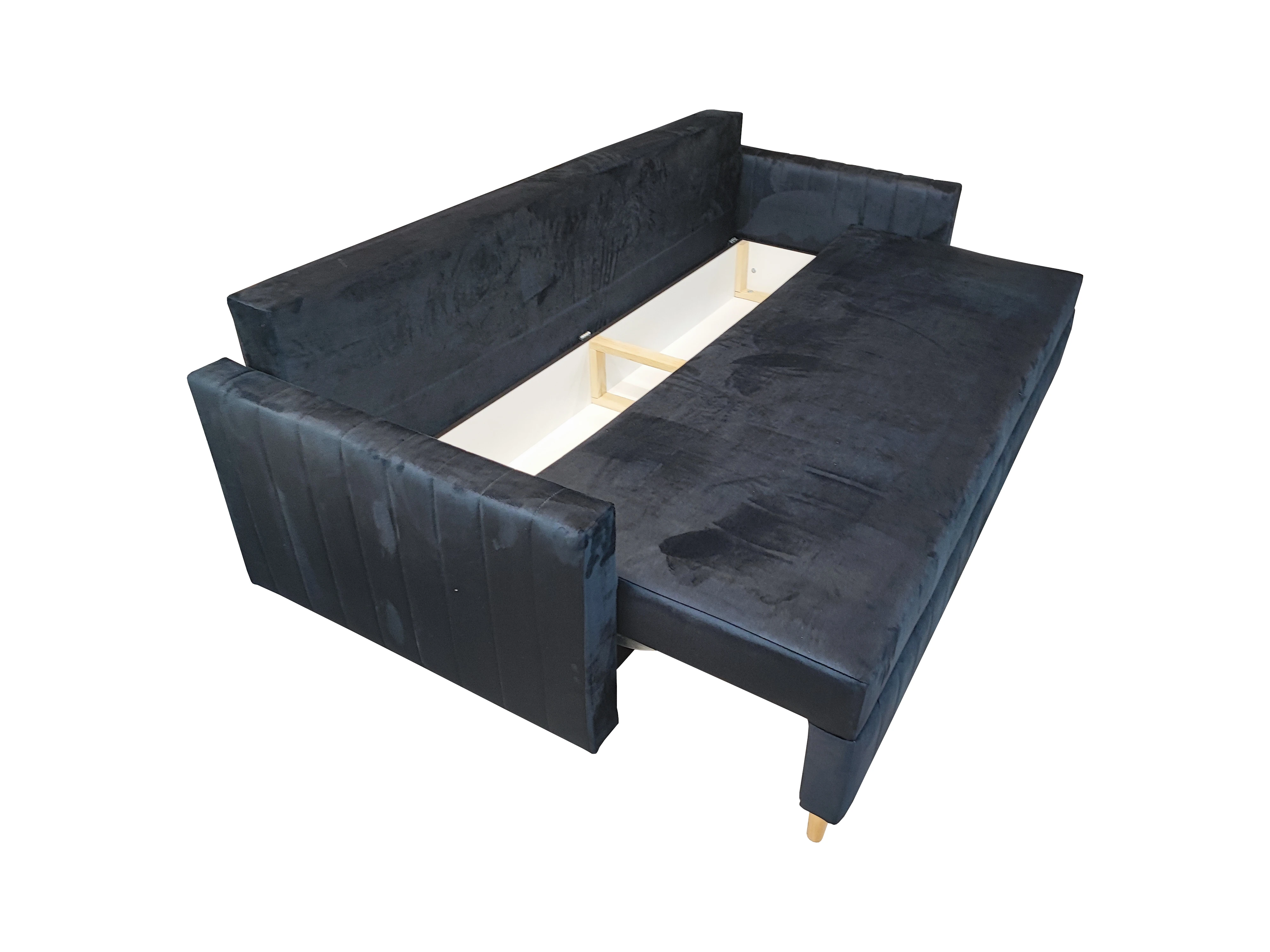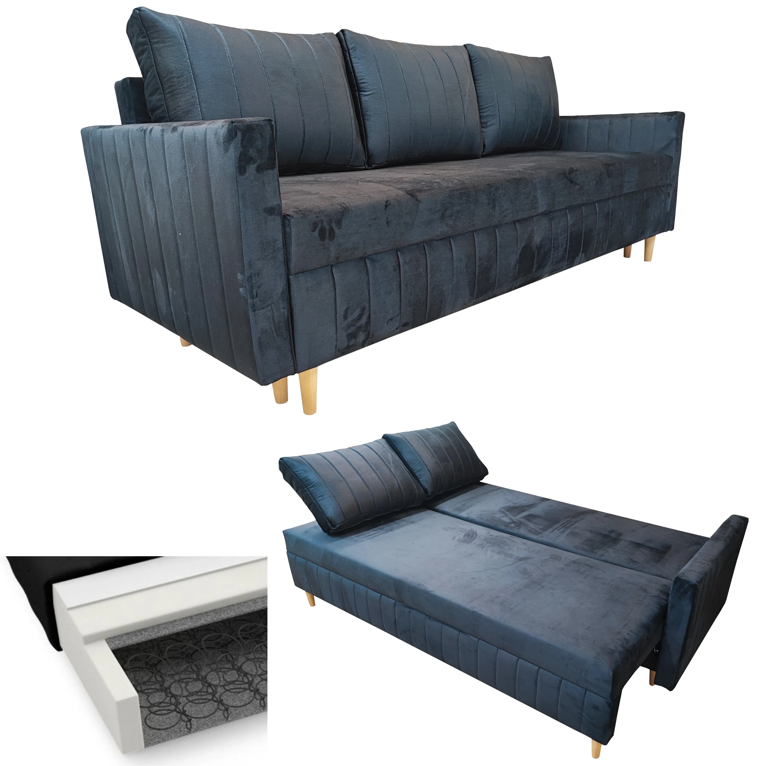 GRANATOWA KANAPA ROZKŁADA DO SALONU SOFA FRIDA FUNKCJA SPANIA SPRĘŻYNY WELUR POJEMNIK