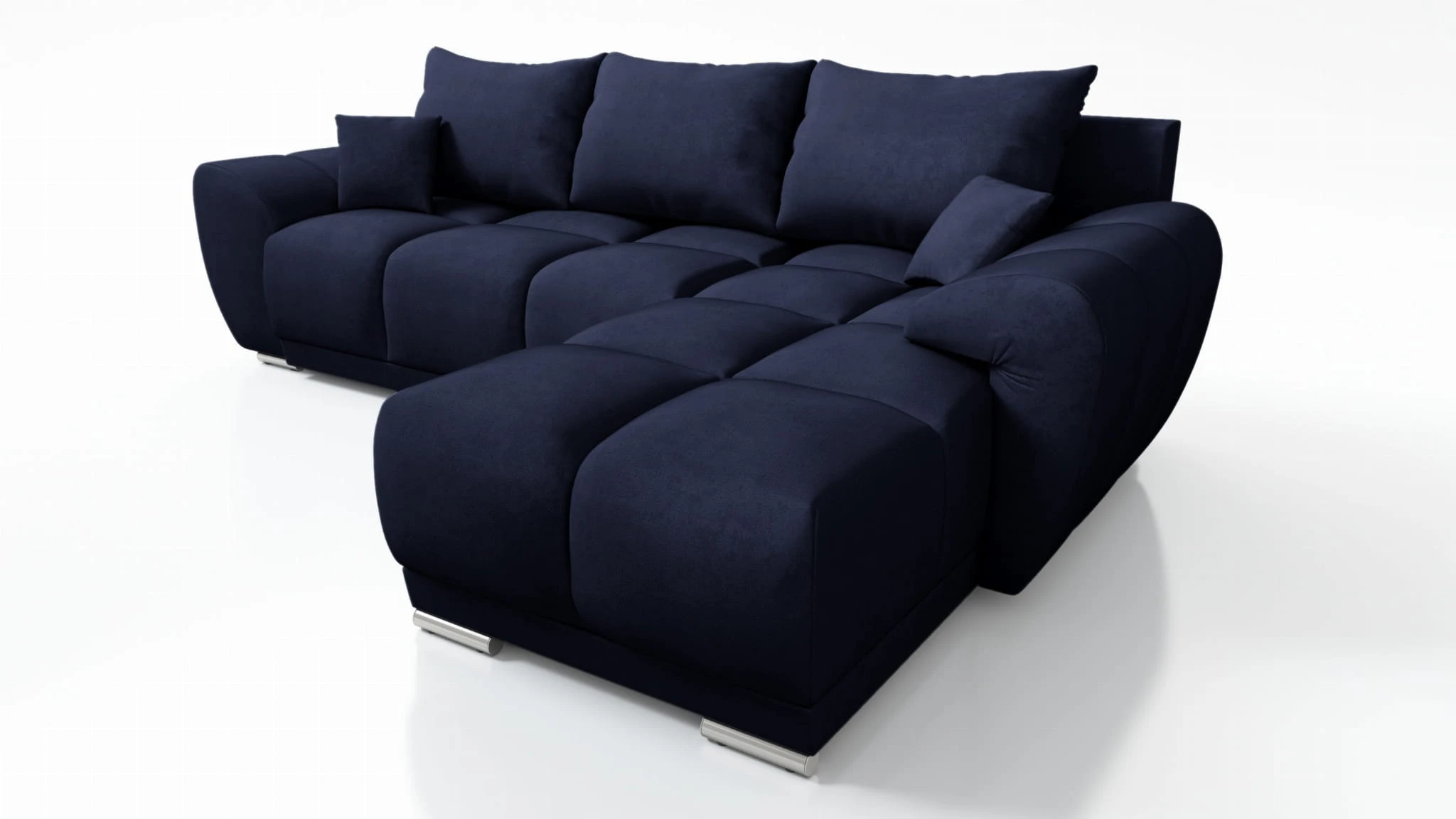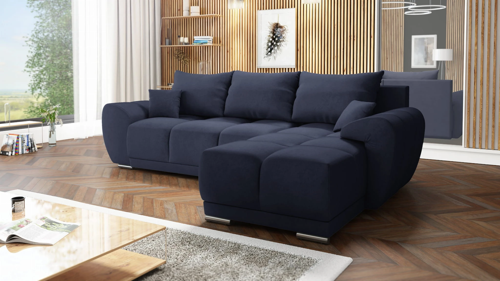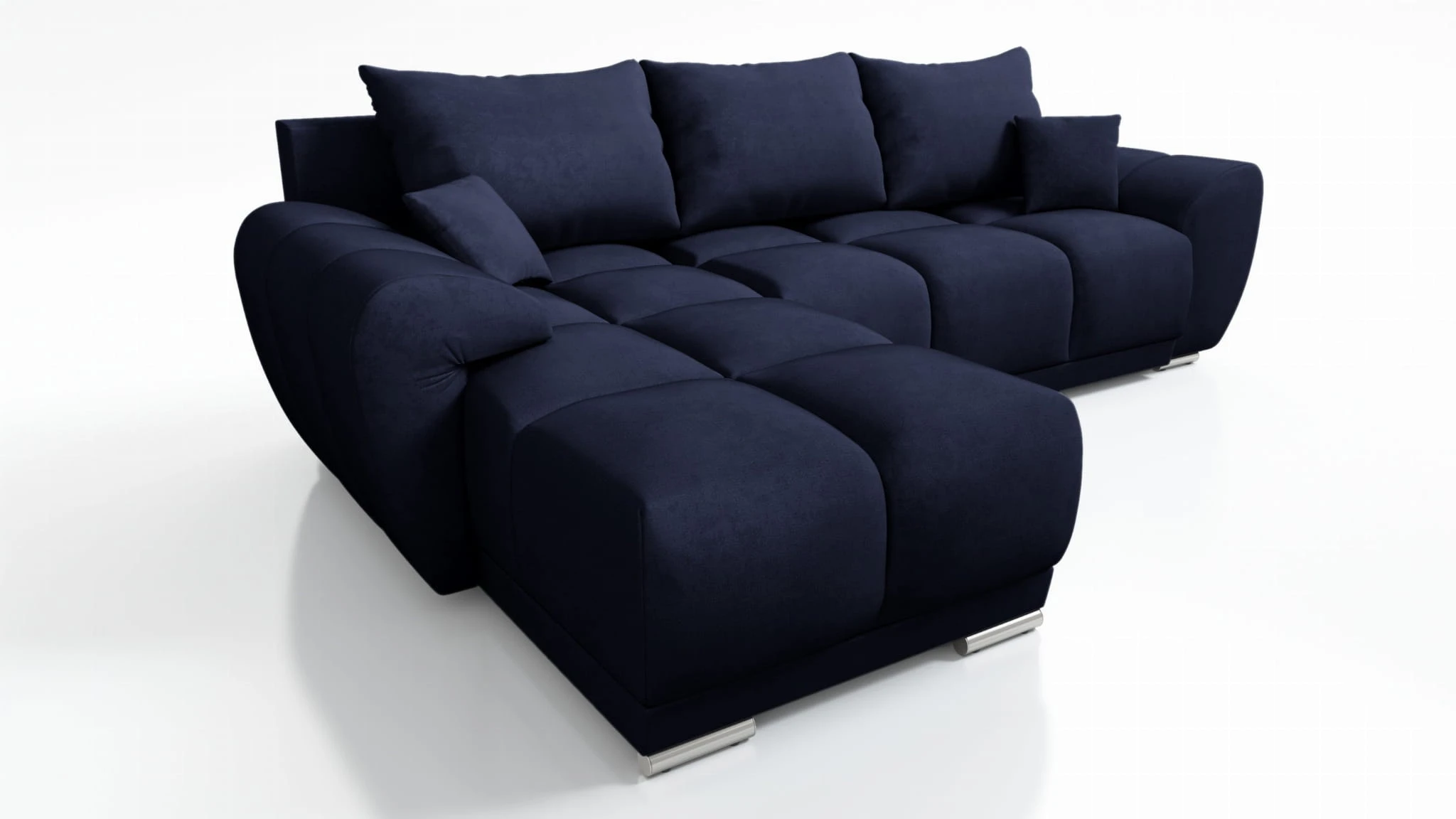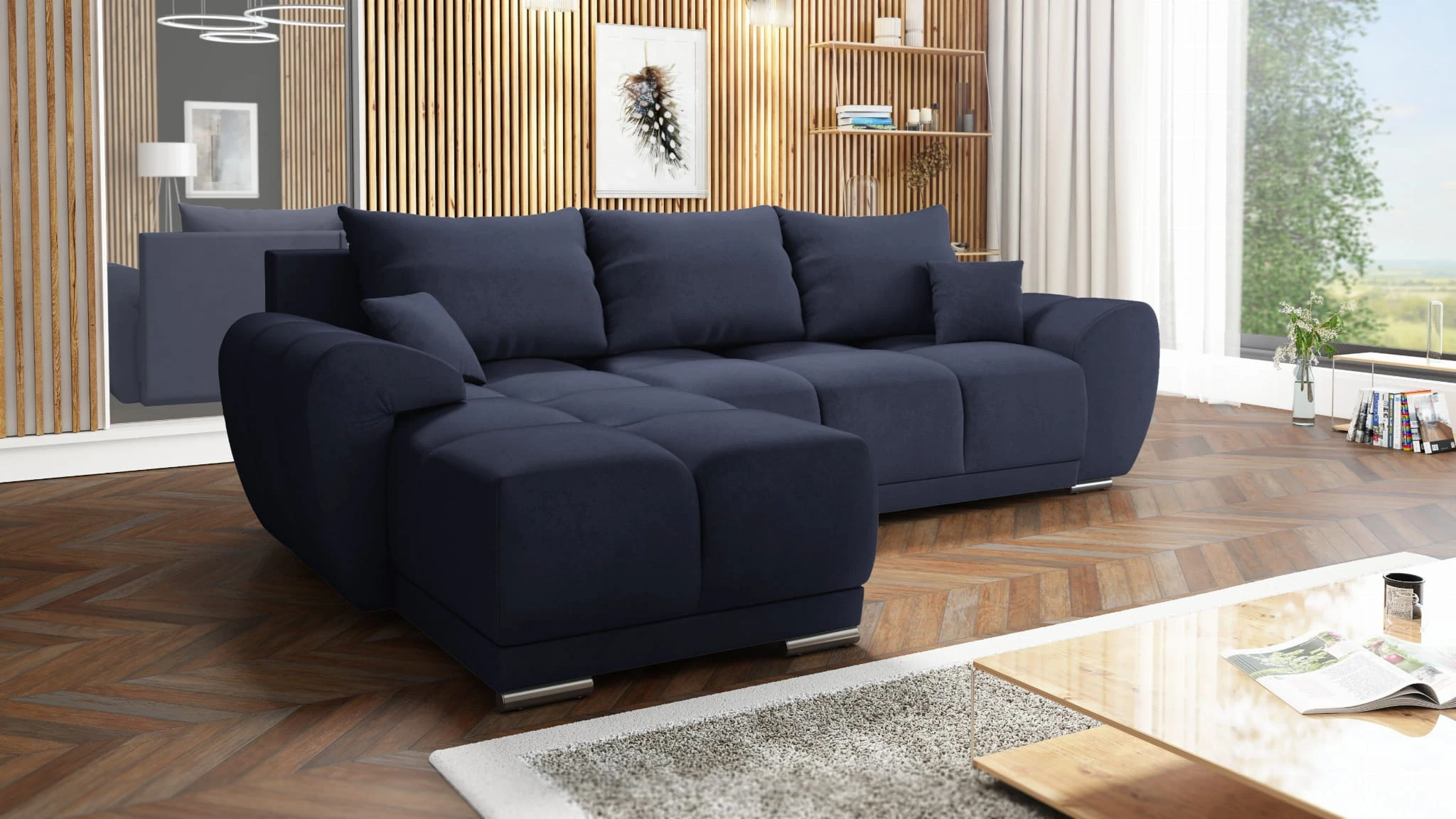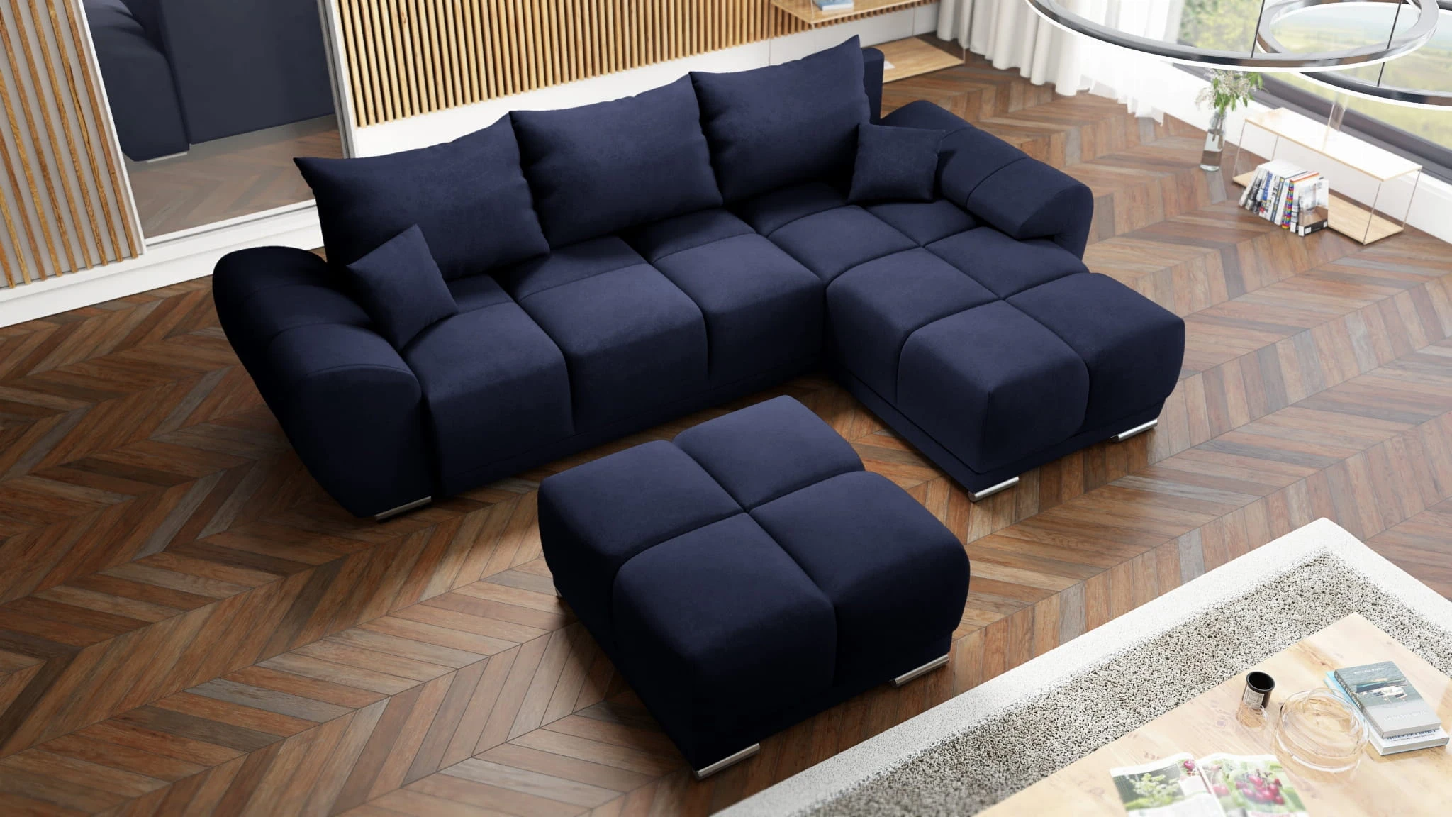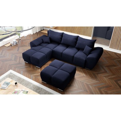 GRANATOWY NAROŻNIK DO SALONU ROZKŁADANY FUNKCJA SPANIA HONEY L + DUŻA PUFA