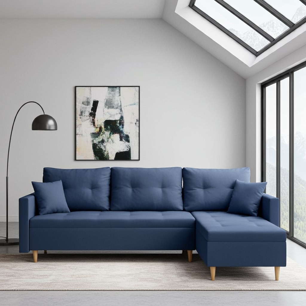 GRANATOWY NAROŻNIK ROZKŁADANY Z FUNKCJĄ SPANIA SCANDIK PIK 2X POJEMNIK