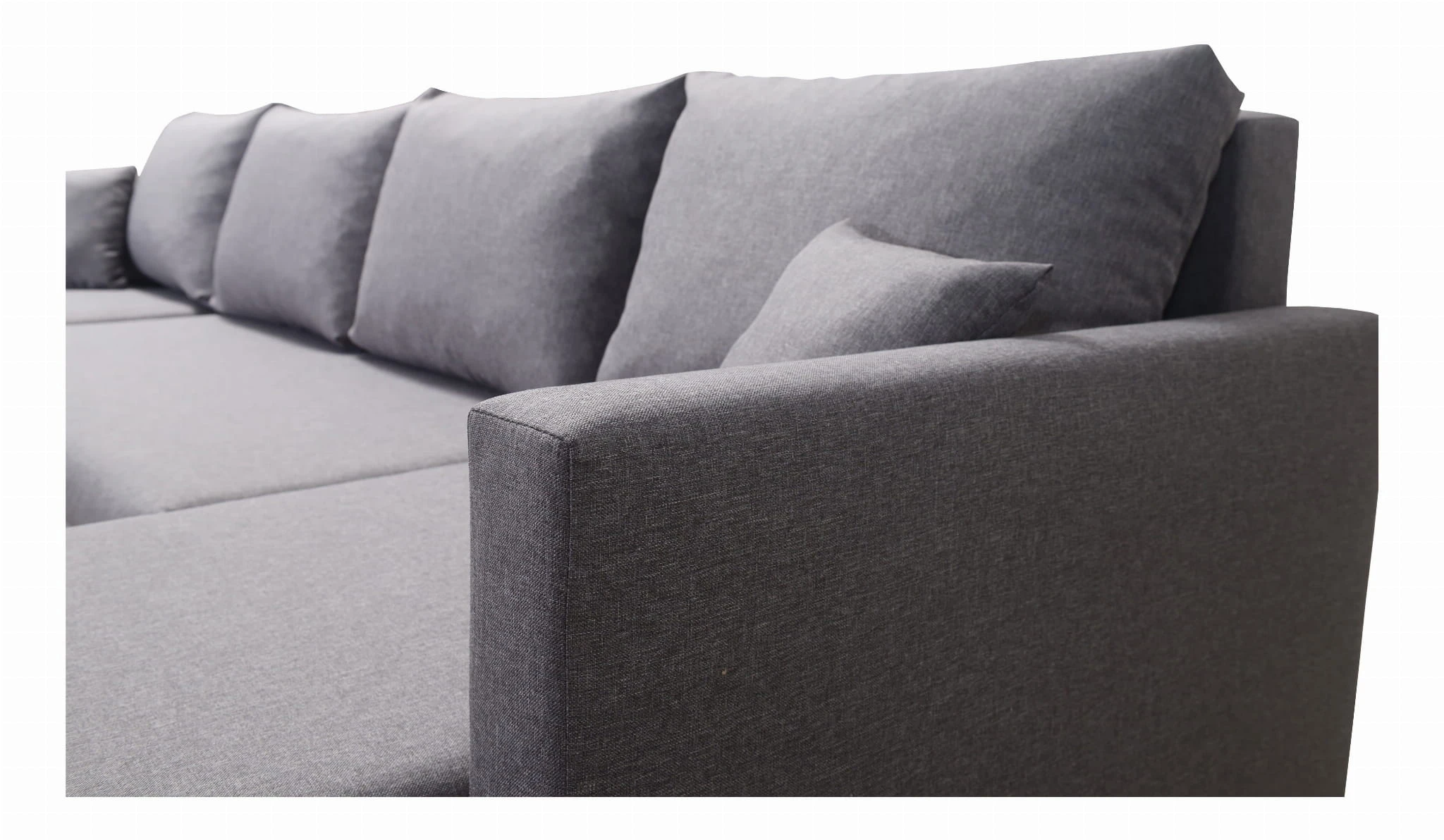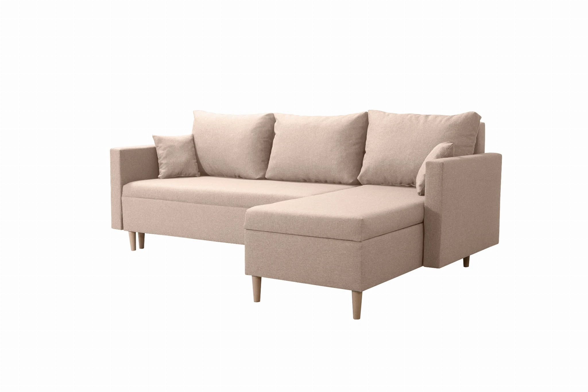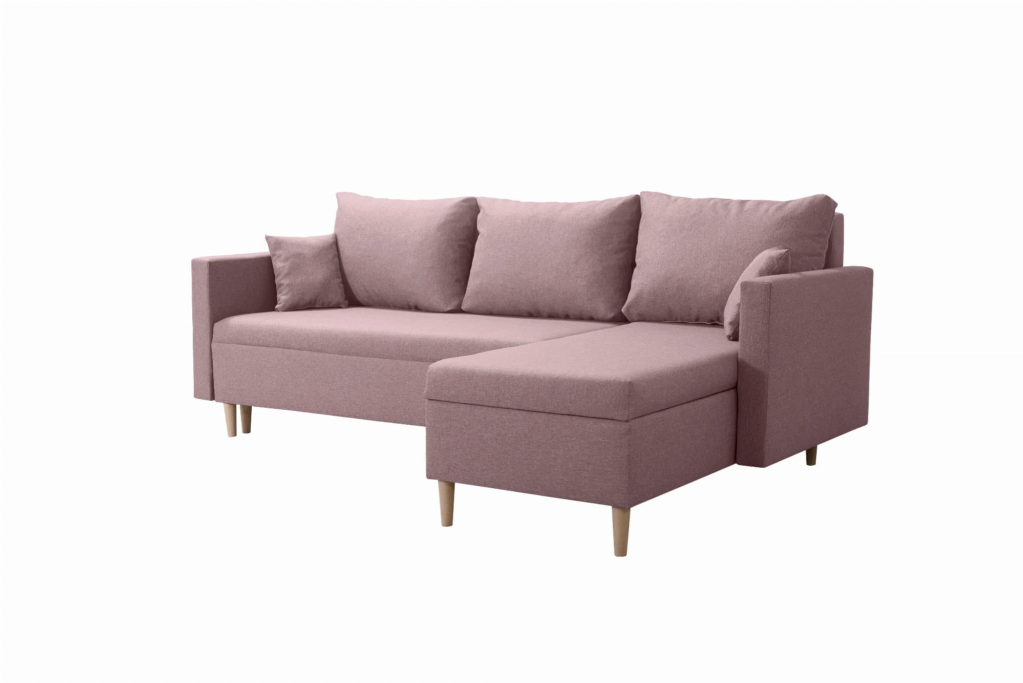 Narożnik posiada wygodną funkcję spania o powierzchni 140x200 cm. Dodatkowo skandynawska rogówka posiada dwa pojemniki na pościel, dzięki czemu zmieścisz w nim pościel, koce oraz inne przedmioty, które nie znalazły miejsca w szafie czy komodzie. W komplecie z narożnikiem otrzymujesz aż pięć poduszek, a jeśli zechcesz to możemy wykonać je w innym kolorze niż narożnik. Kontrastowe zestawienie kolorów poduszek oraz narożnika do salonu to ciekawe rozwiązanie, które nada dodatkowego uroku.