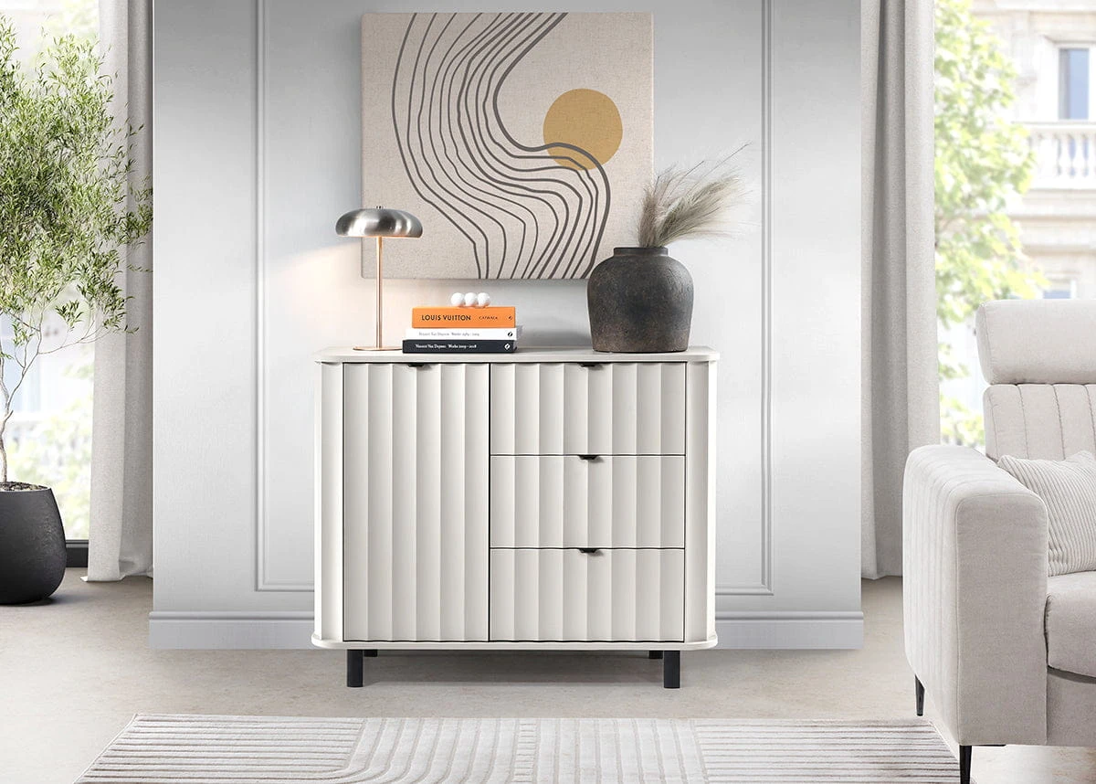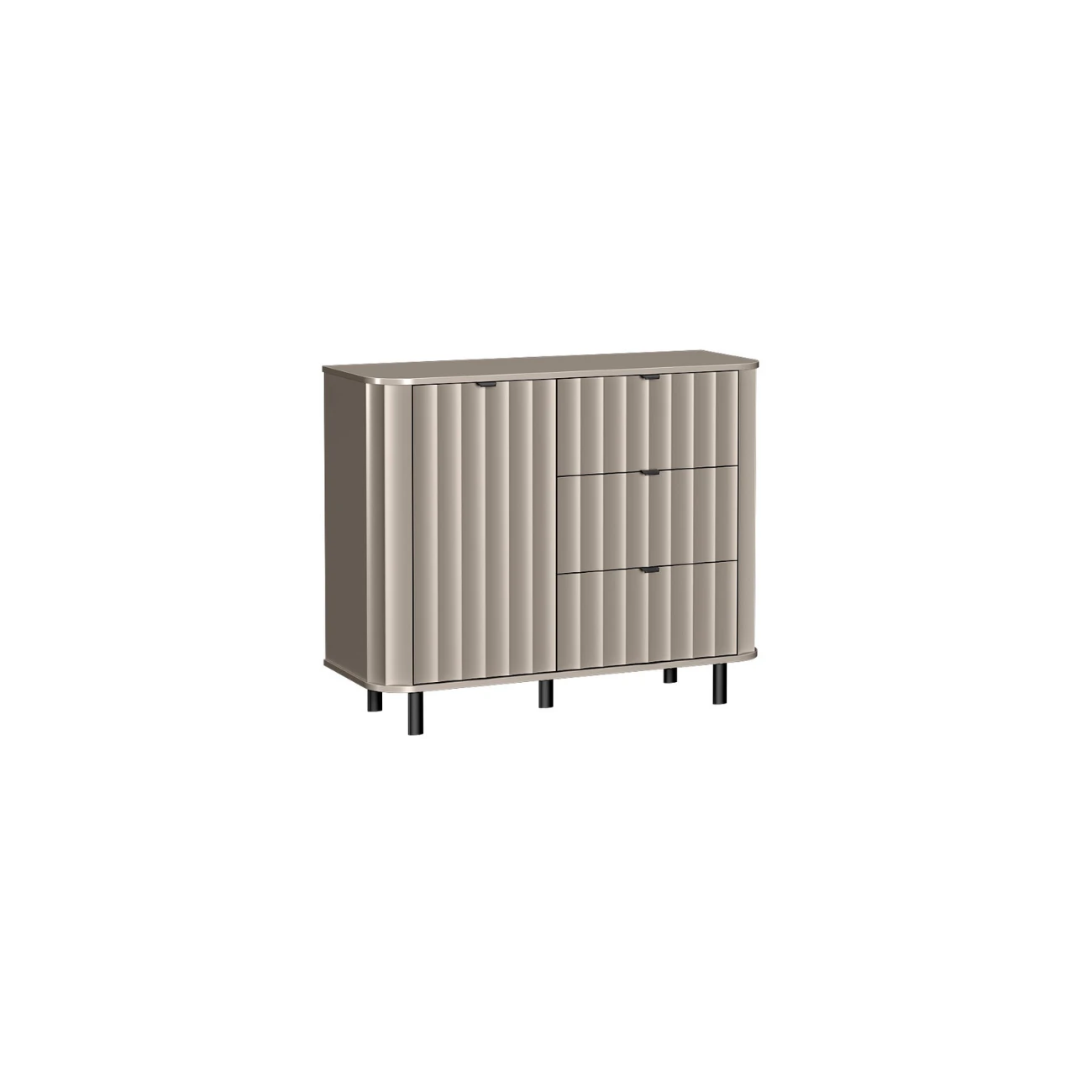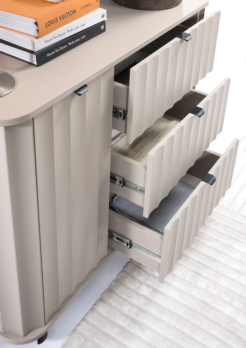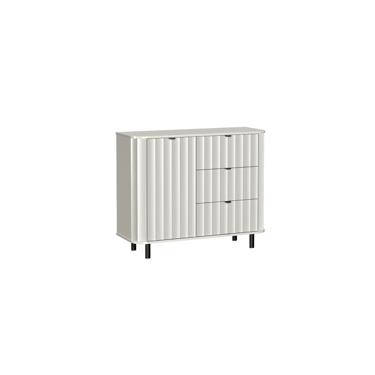 Stylowa komoda na ubrania Nova to połączenie elegancji z funkcjonalnością. Komoda z trzema szufladami Nova wyróżnia się swoją estetyką. Jako pierwsze rzucają się w oczy szerokie ryflowania na frontach szafek. Obłe kształty frezowania frontów komody przyciągają wzrok oraz podkreślają klasę komody. Kolejnym elementem ozdobnym są zaokrąglone krawędzie. Rogi nie są ścięte pod kątem prostym, lecz są stylowo zaokrąglone. Warto zaznaczyć, że jest to nie tylko wizualne rozwiązanie, lecz zaokrąglone krawędzie to również większe bezpieczeństwo w Twoim salonie!