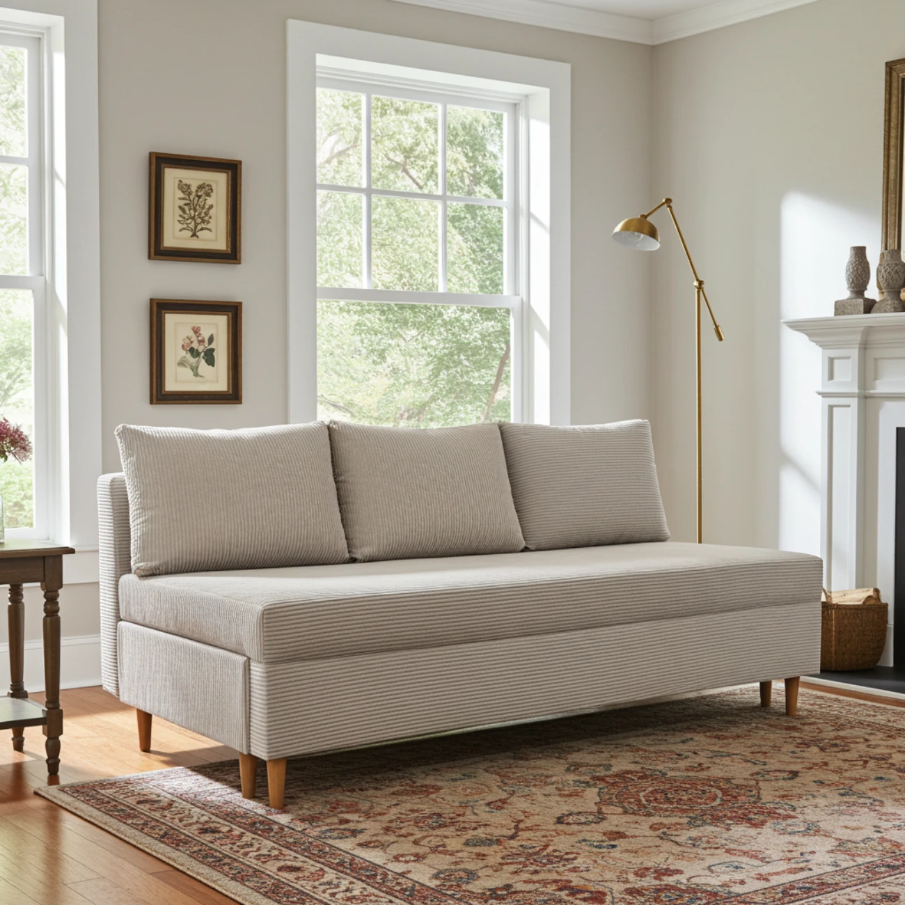 Wysokie, 13 cm nóżki z drewna nadają kanapie lekkości i ułatwiają sprzątanie, także robotem sprzątającym. Całość obita miękkim sztruksem — eleganckim, przyjemnym w dotyku i odpornym na codzienne użytkowanie.