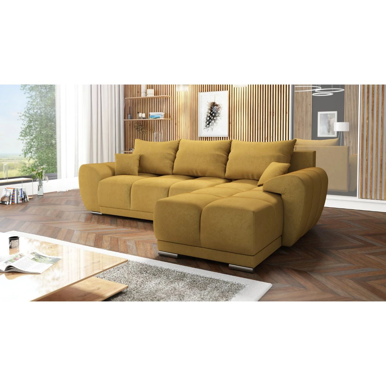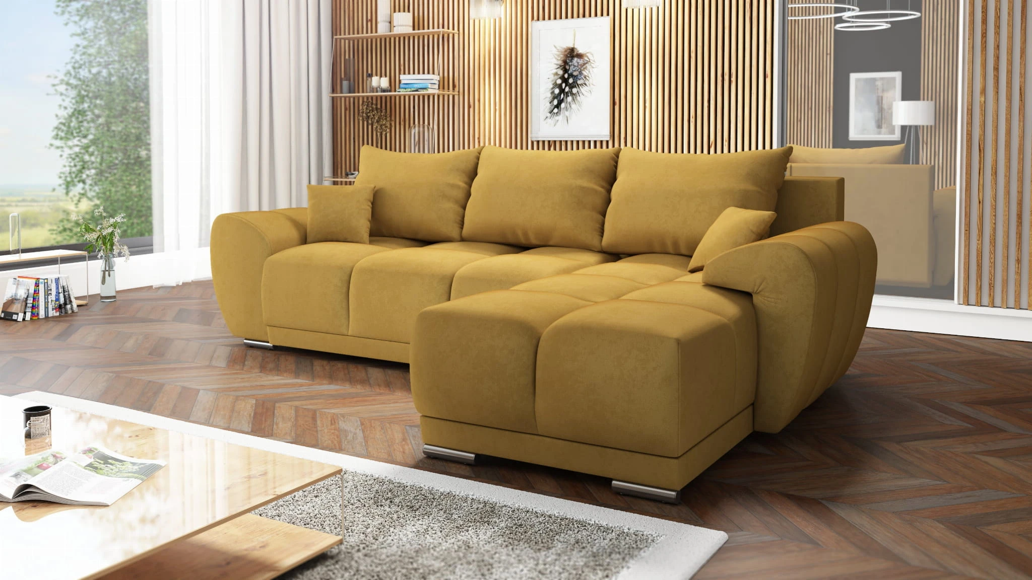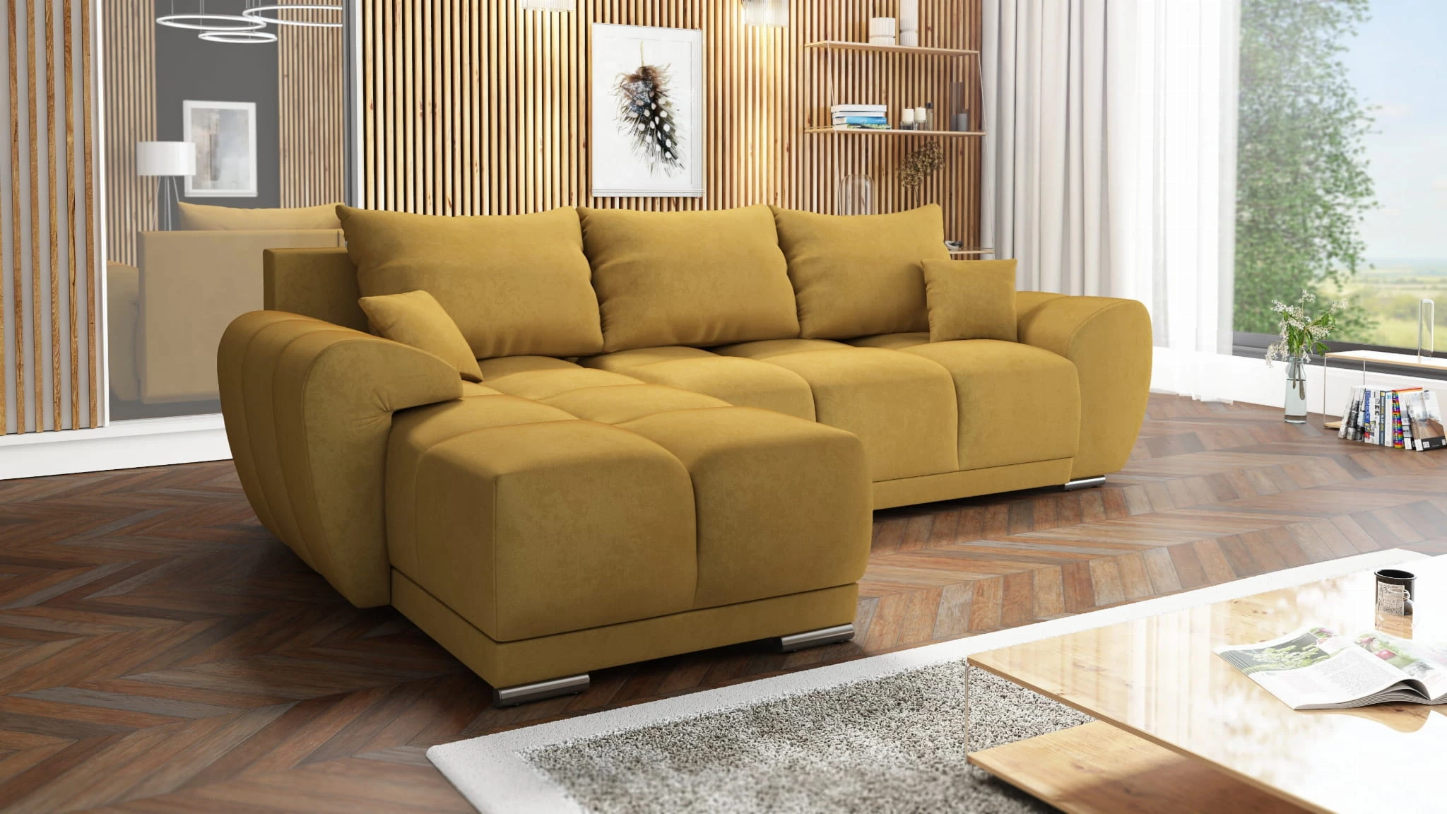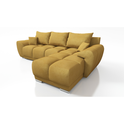 MUSZTARDOWY NAROŻNIK ROZKŁADANY DO SALONU ROGÓWKA Z FUNKCJĄ SPANIA HONEY L
