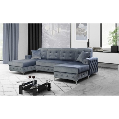 --Narożnik Viki to elegancki mebel, który świetnie sprawdzi się w większych pomieszczeniach. Przestronna bryła w literze U pomieści wiele osób. Narożnik posiada 2 pojemniki na pościel oraz dużą funkcję spania typu puma, która sprawdzi się świetnie także do spania codziennego.