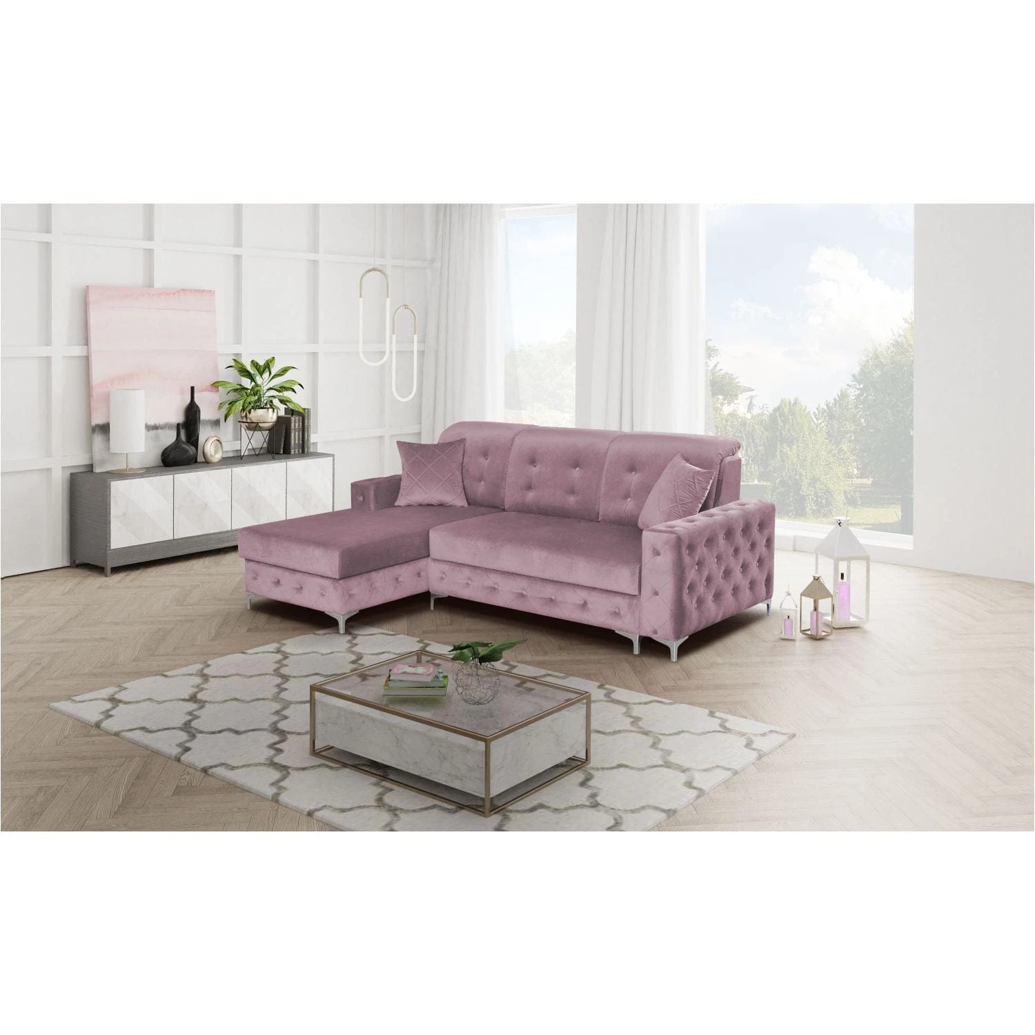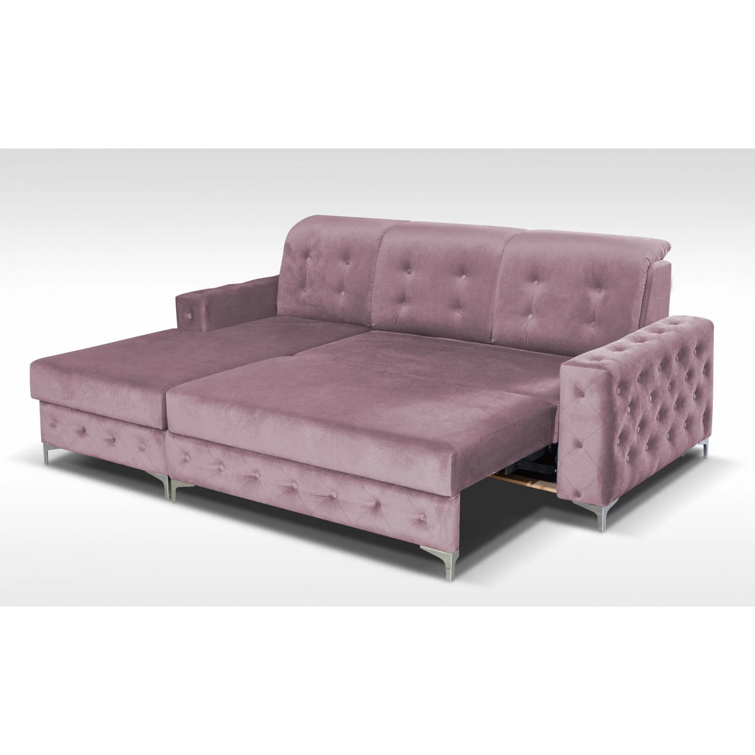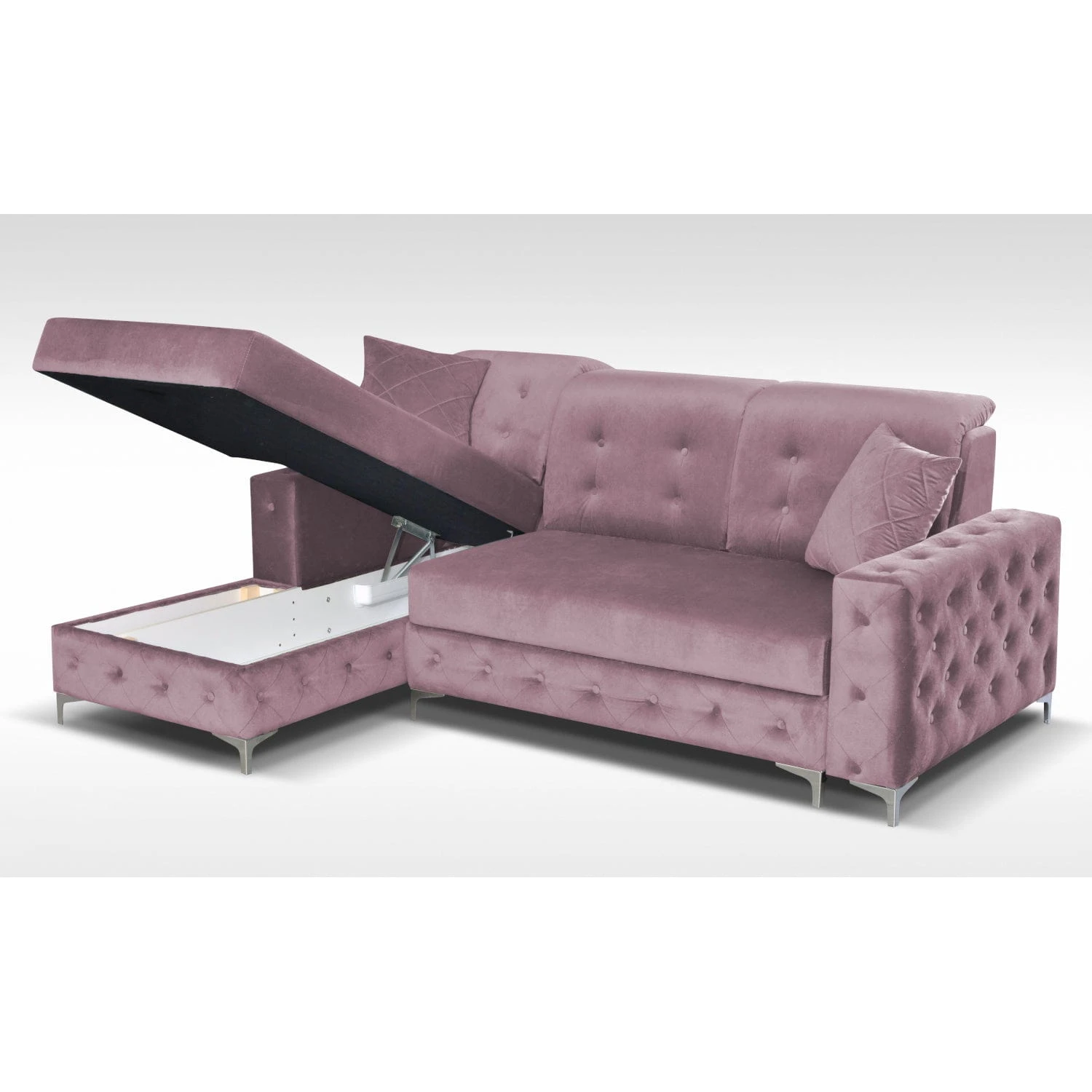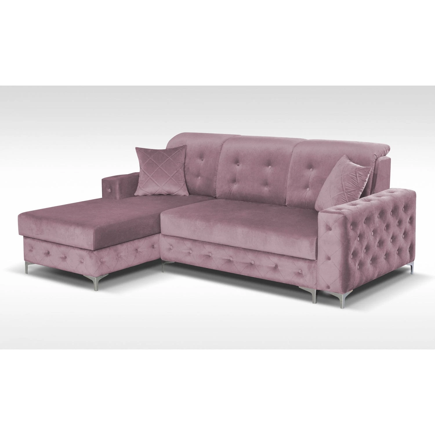 Narożnik Viki mini to bardziej kompaktowa wersja narożnika Viki . Pikowania z guzikami sprawiają, że mebel prezentuje się bardzo elegancko. Posiada pojemnik na pościel oraz funkcję spania typu puma, co sprawia, że narożnik świetnie nadaje się do spania codziennego.