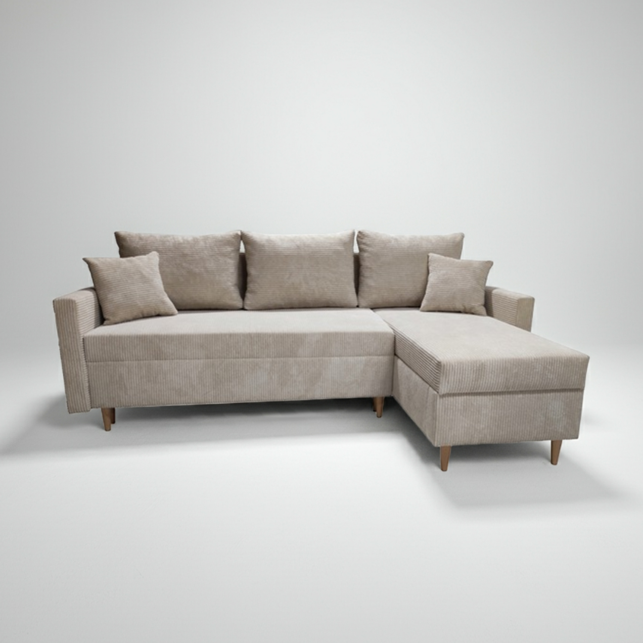Narożnik rozkładany posiada wygodną funkcję spania o powierzchni 140x200 cm. Dla Twojej wygody materac został wypełniony pianką oraz sprężynami bonell. Dodatkowo skandynawska rogówka posiada dwa pojemniki na pościel, dzięki czemu zmieścisz w nim pościel, koce oraz inne przedmioty, które nie znalazły miejsca w szafie czy komodzie.
