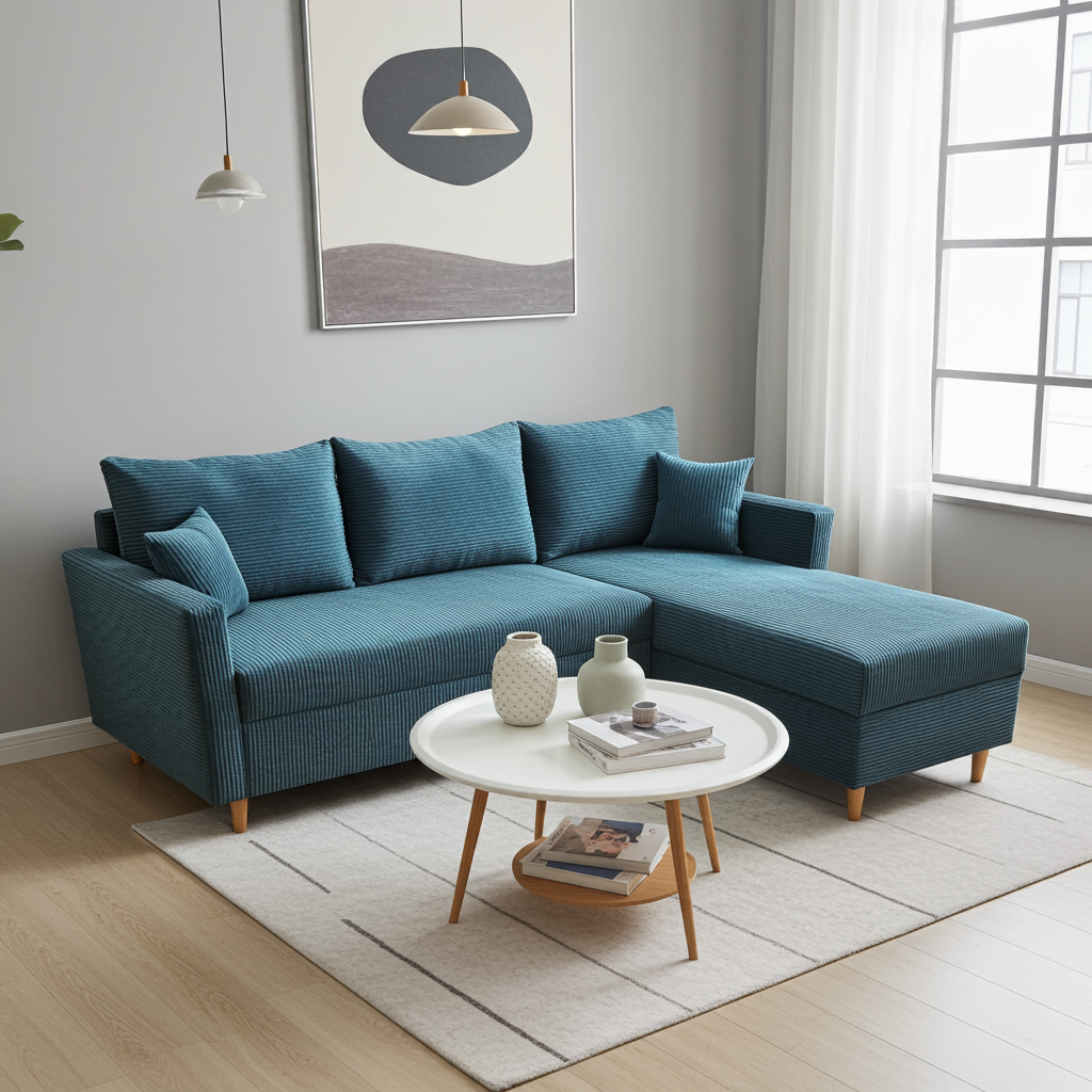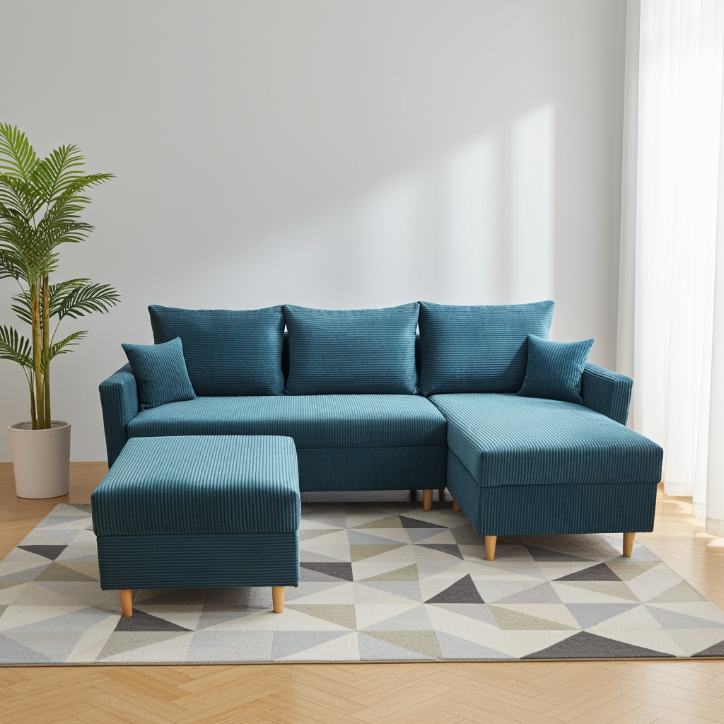 NIEBIESKI NAROŻNIK ROZKŁADANY SCANDIK SZTRUKS BONELL 2X POJEMNIK ROGÓWKA + PUFA FUNKCJA SPANIA