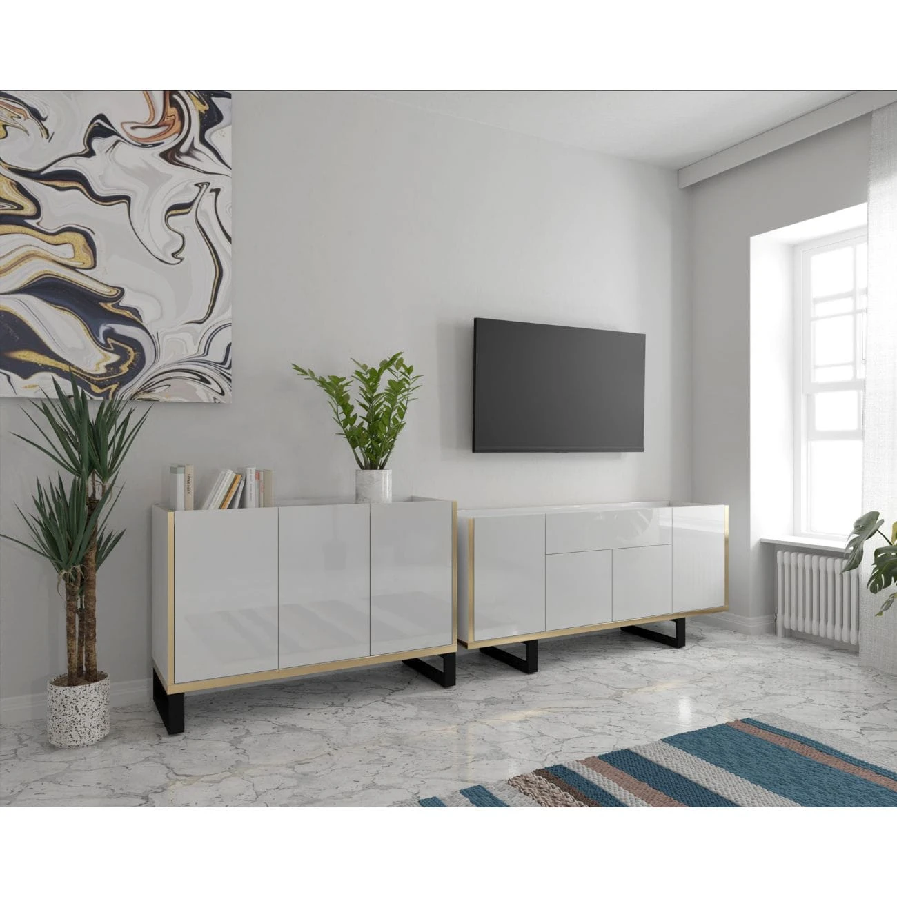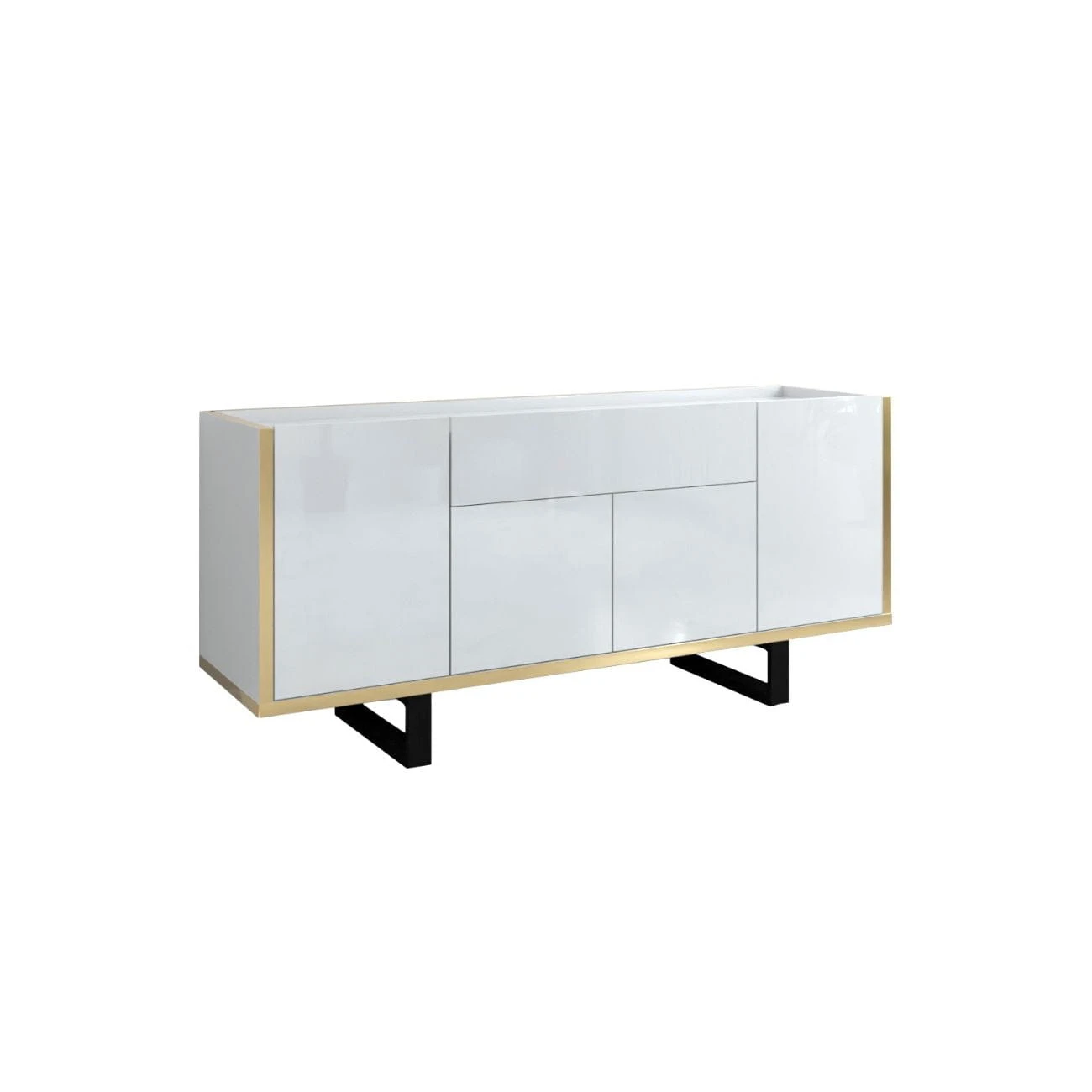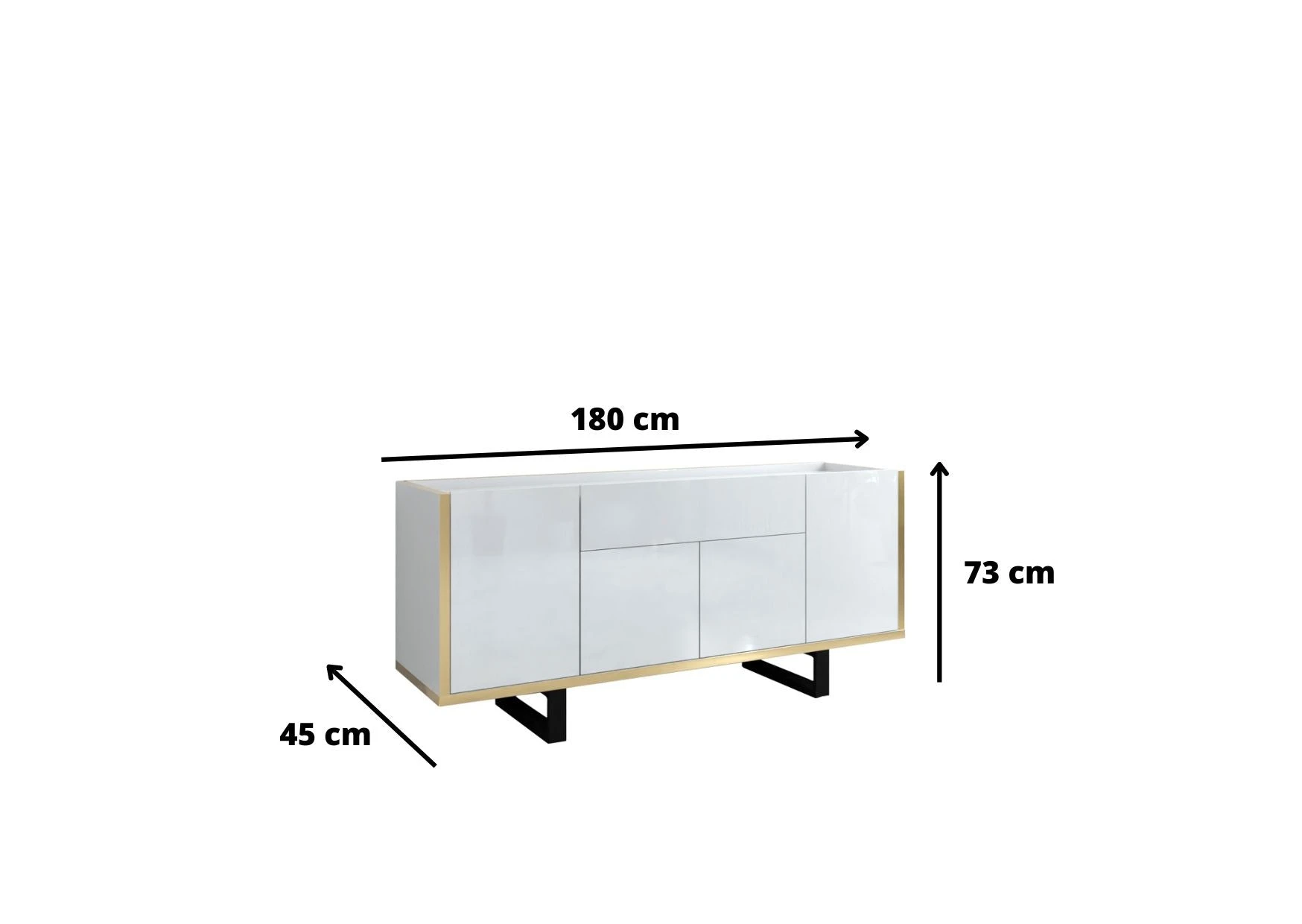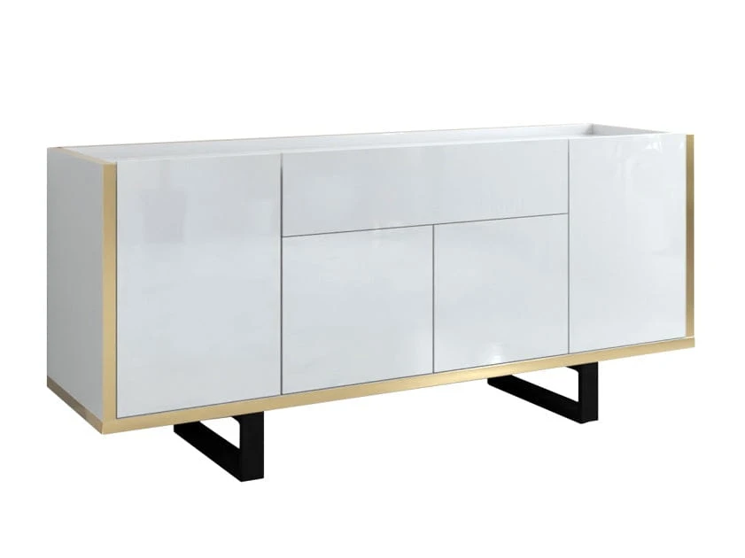 Goldi to pojemna, świetnie zaprojektowana szafka RTV, która wpasuje się idealnie w nowoczesne, designerskie wnętrza. Z myślą o praktycznym przechowywaniu posiada zamknięte za frontami półki. Szerokość blatu pozwala nawet na umieszczenie na niej telewizora o wielkości 77" Zastosowana złota wstawka dodaje elegancji i niebanalnego wyglądu.