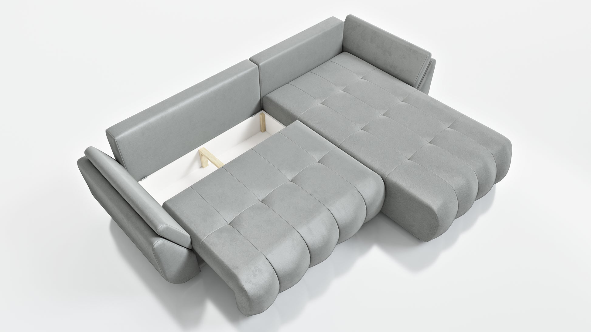 Rozkładanie jest szybkie i proste – wystarczy zdjąć poduszki, unieść siedzisko i wysunąć je do przodu, a następnie opuścić oparcie. W kilka chwil narożnik zamienia się w komfortowe łóżko.