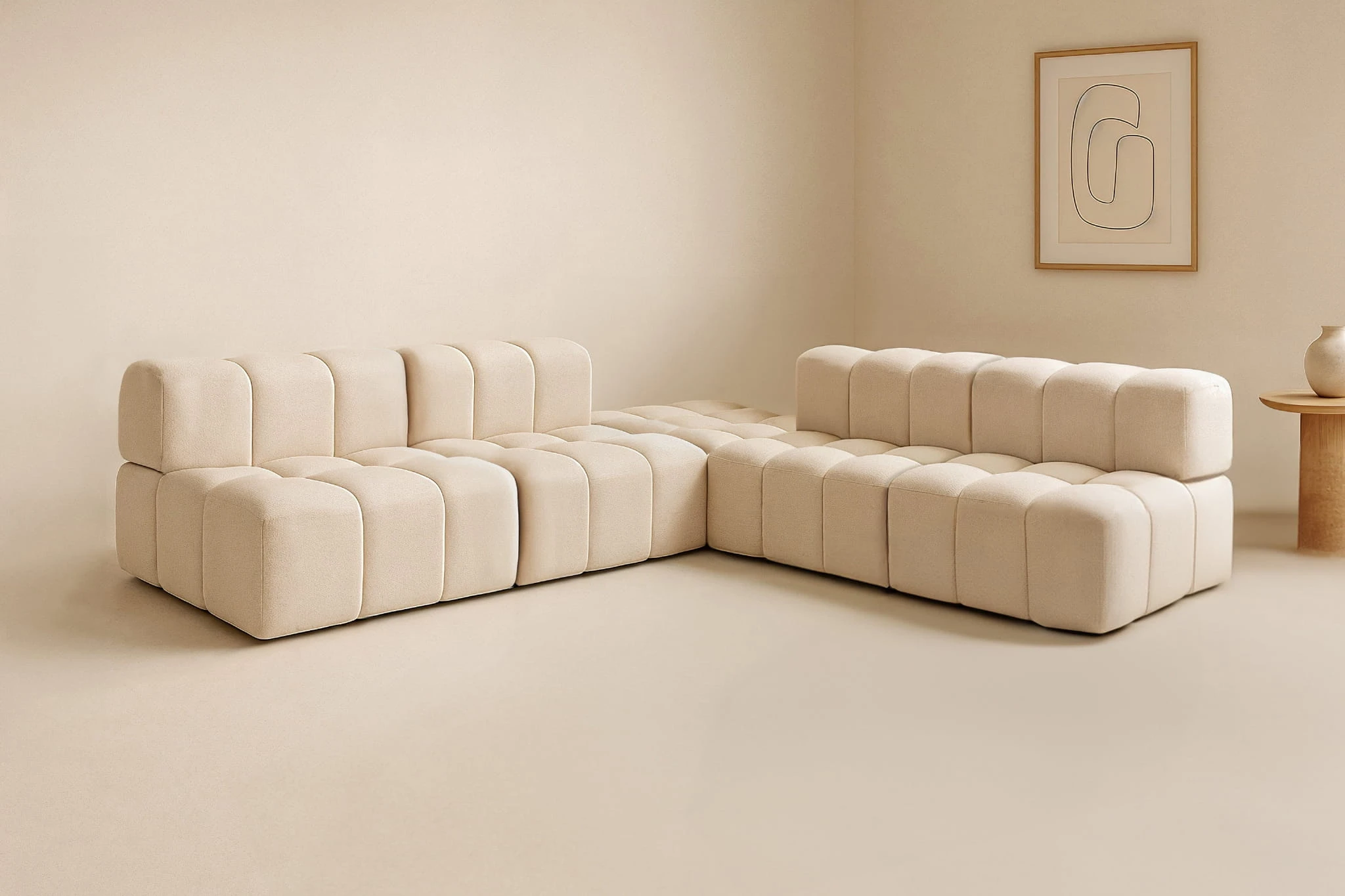 Możesz zmienić konstrukcję narożnika lub odpiąć moduły i korzystać z nich jako osobnych dwóch sof z pufą. Możesz połączyć pufę do jednej z sof i stworzyć zestaw mini narożnika z sofą dwójką. Możesz połączyć ze sobą dwie sofy dwójki i stworzyć wielką sofę do salonu z pufą. Już trzy moduły pozwalają Ci na stworzenie wielu unikalnych kombinacji.