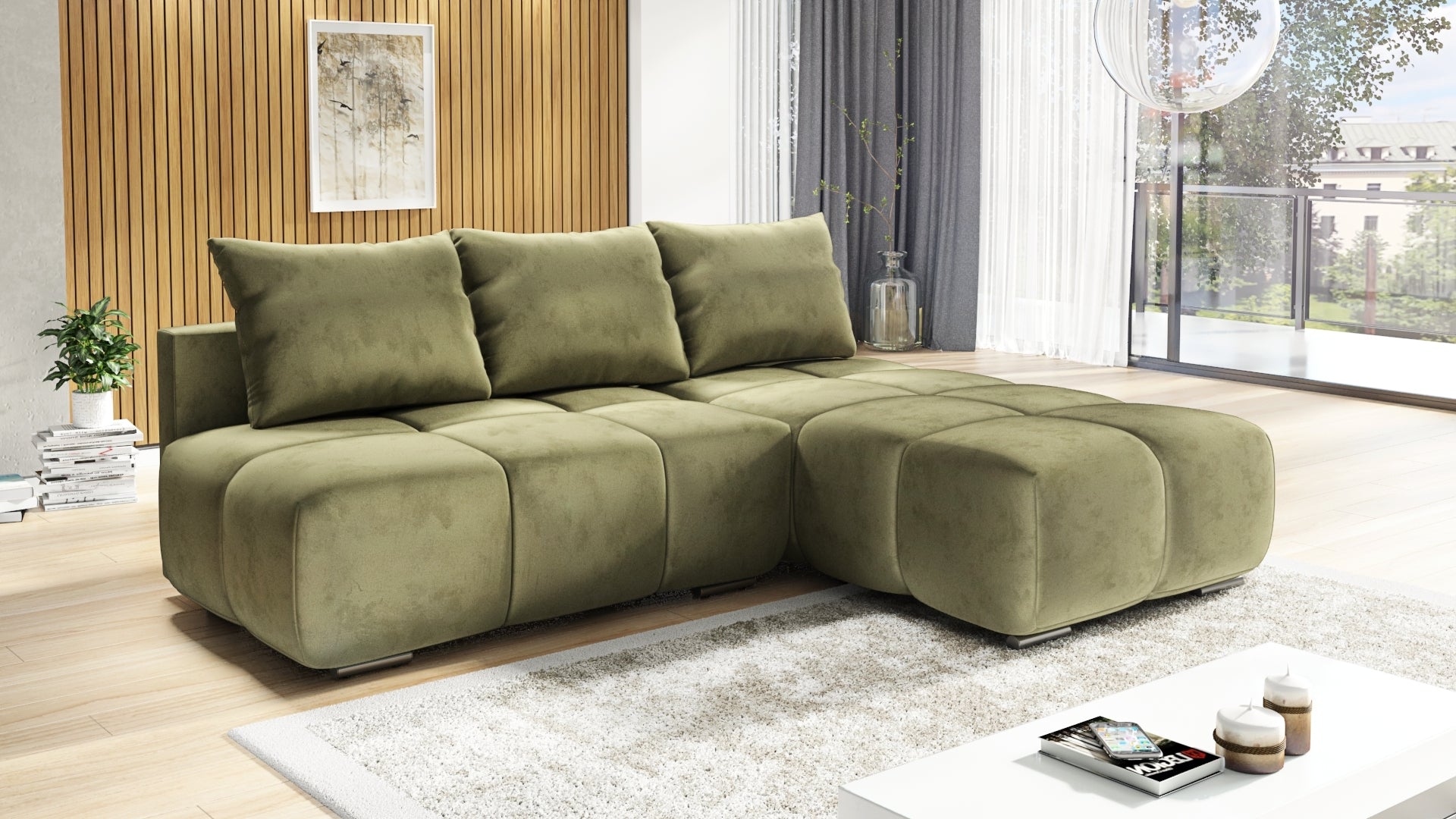 Nowoczesny narożnik Flash to idealne połączenie wygody, trwałości i designu. Charakterystyczne pikowanie siedziska i otoman, przypominające kostki czekolady, dodaje mu wyjątkowego stylu.