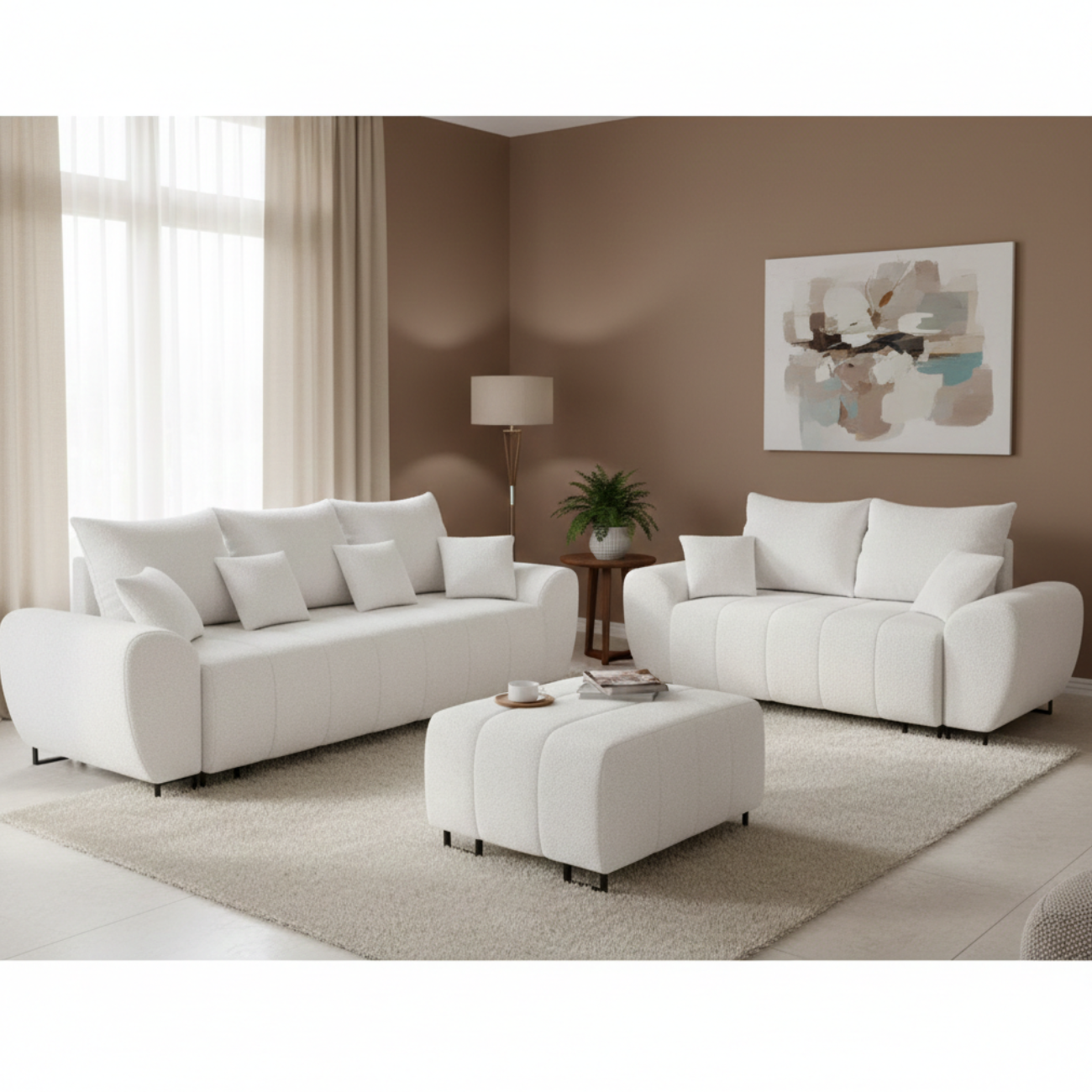 ✔️ Efektowny, dekoracyjny wygląd Naturalna, potrójna faktura bouclé dodaje meblom charakteru i doskonale wpisuje się w nowoczesnych aranżacjach wnętrz — od stylu skandynawskiego, przez minimalistyczny, po boho.