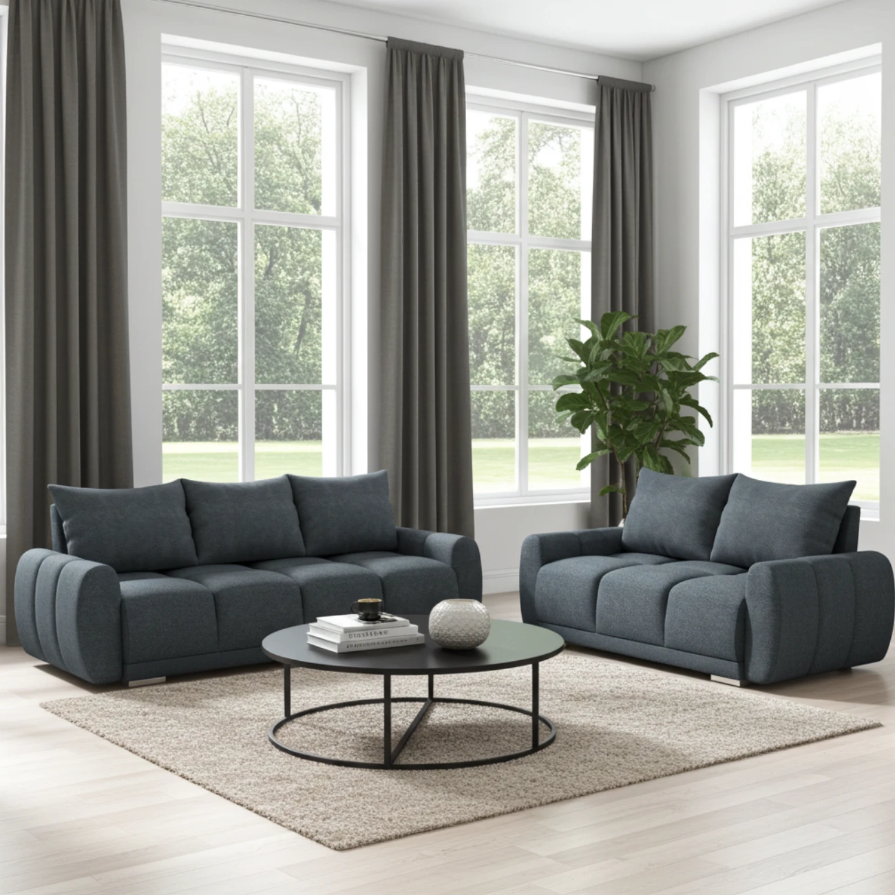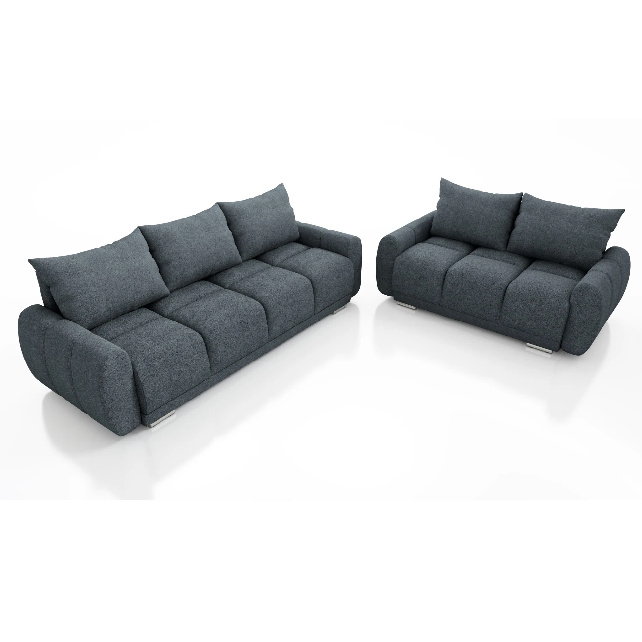 Sercem zestawu jest trzyosobowa kanapa rozkładana Honey z funkcją spania 150x200 cm i dużym pojemnikiem na pościel. Dodatkowo zestaw uzupełnia dwuosobowa sofa o siedzisku 150 cm – wygodna dla dwóch osób.