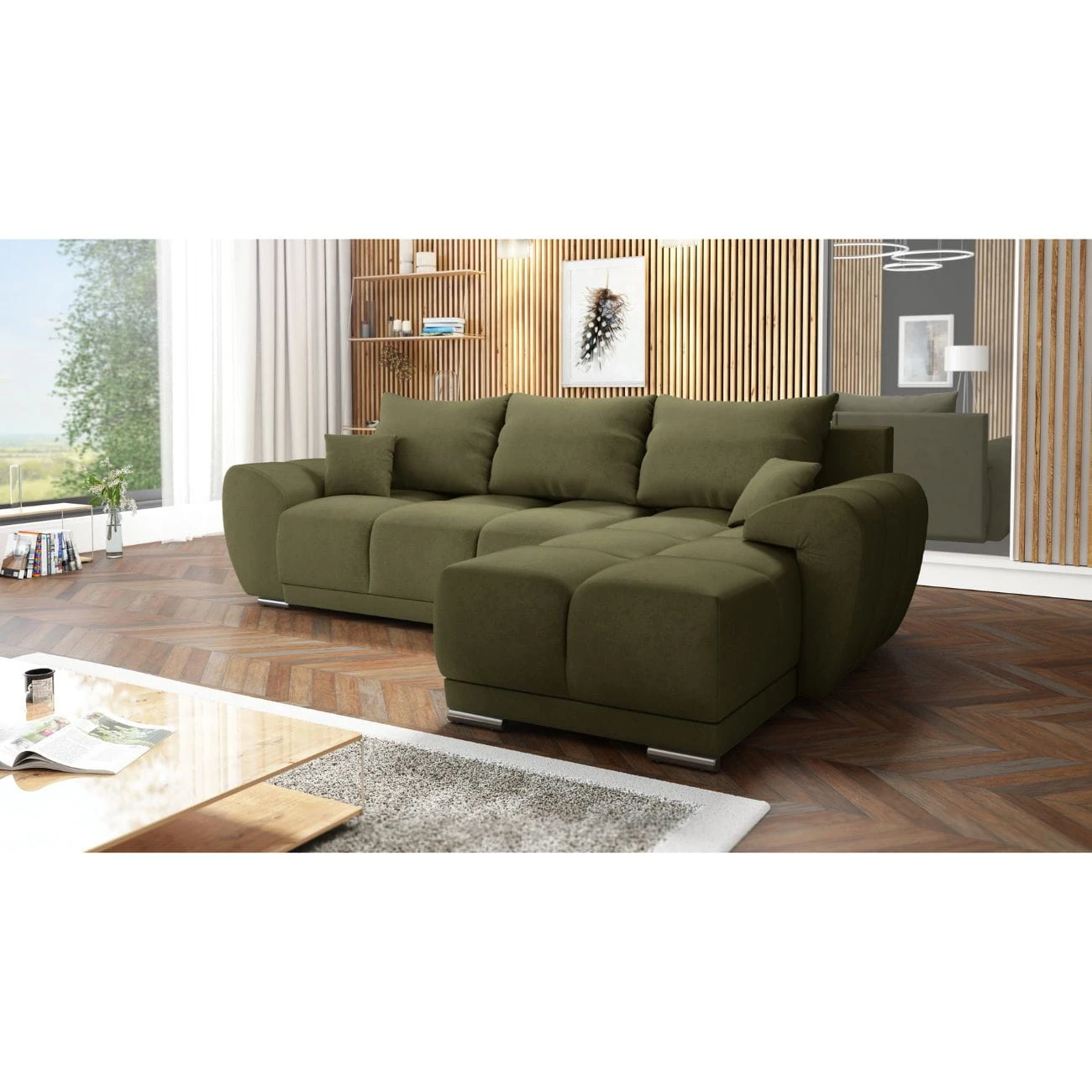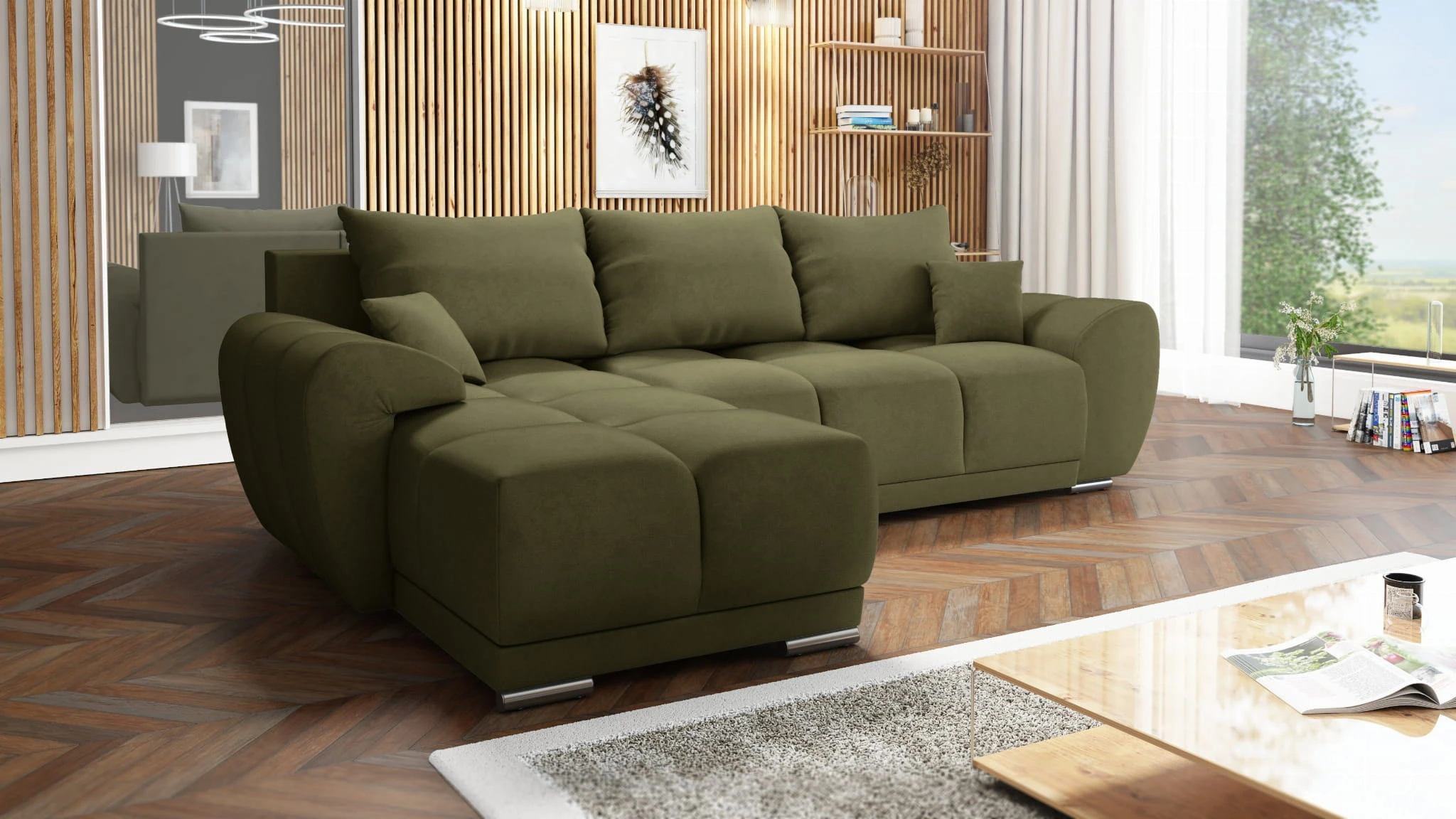 OLIWKOWY PIKOWANY NAROŻNIK ROZKŁADANY ROGÓWKA Z FUNKCJĄ SPANIA HONEY L