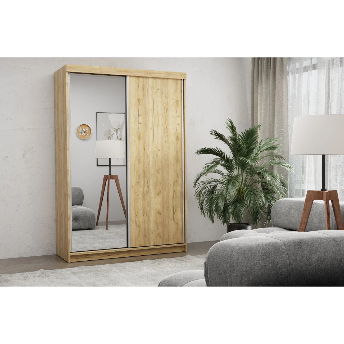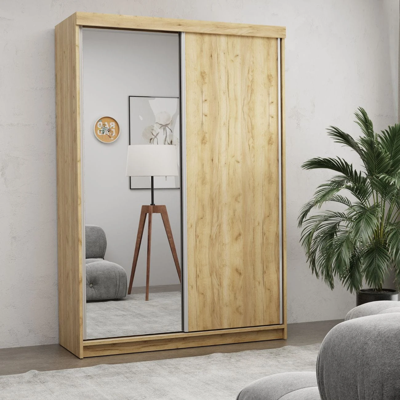 PROSTA SZAFA PRZESUWNA NA UBRANIA Z LUSTREM OLA 150 CM DĄB KRAFT