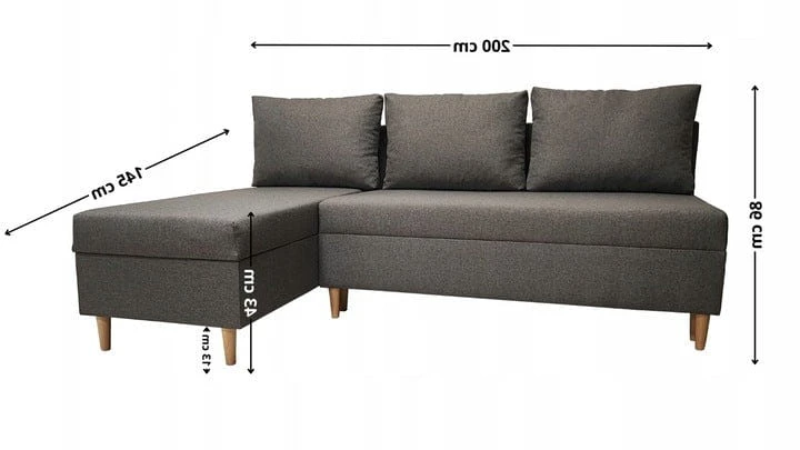 - Kompaktowe wymiary: Z szerokością tylko 200 cm, narożnik jest wyjątkowo poręczny, a mimo to zapewnia pełną funkcjonalność, w tym przestronną powierzchnię do spania.