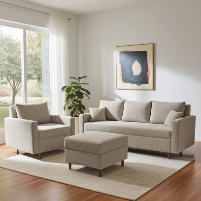 ZGRABNY SZTRUKSOWY DUET DO SALONU: KOMPLET WYPOCZYNKOWY KANAPA ROZKŁADANA Z FOTELEM I PUFĄ