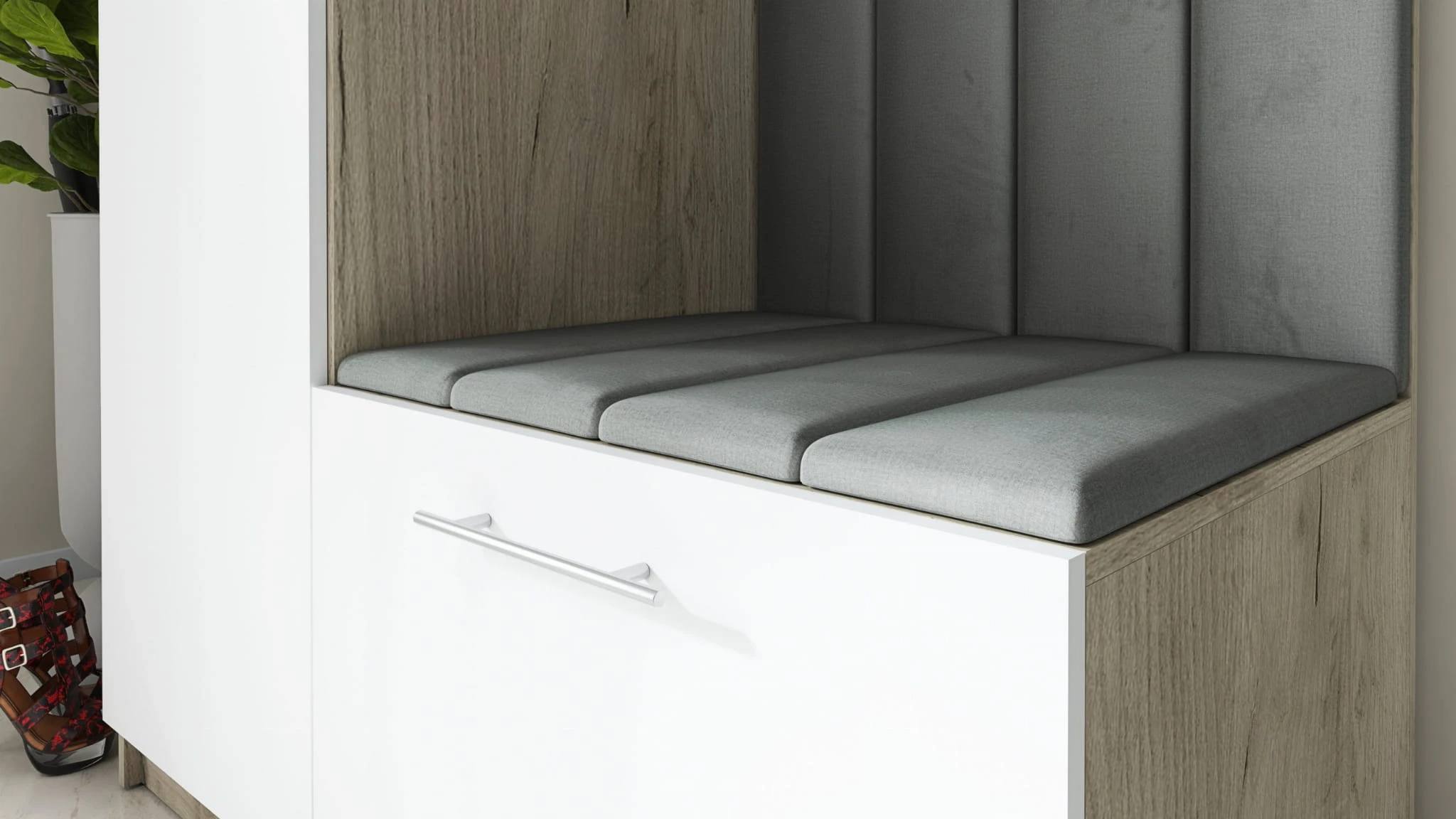 Prawa strona do oczywiście tapicerowanej wnęki z siedziskiem wykonanej w hydrofobowej tkaninie Monolith 84. Szara tapicerka doskonale łączy się z każdą kolorystyką szafy, a komfortowy materiał jest wygodny w dotyku. Pod siedziskiem znajdują się cztery miejsca, które są stosowane jako szafka na buty. Nad tapicerowaną wnęką znajduje się kolejna nadstawka z wnętrzem przedzielonym na pół.