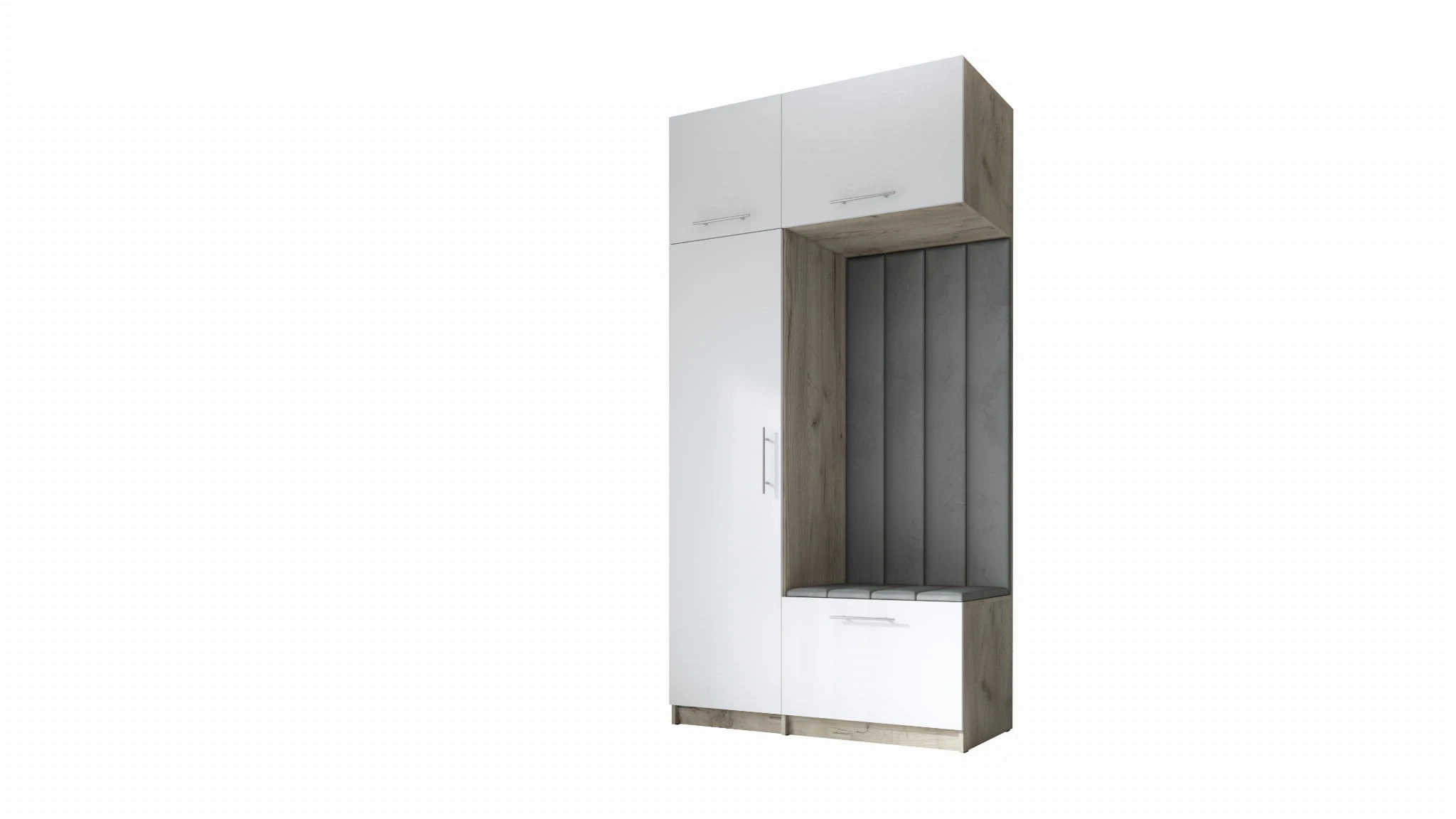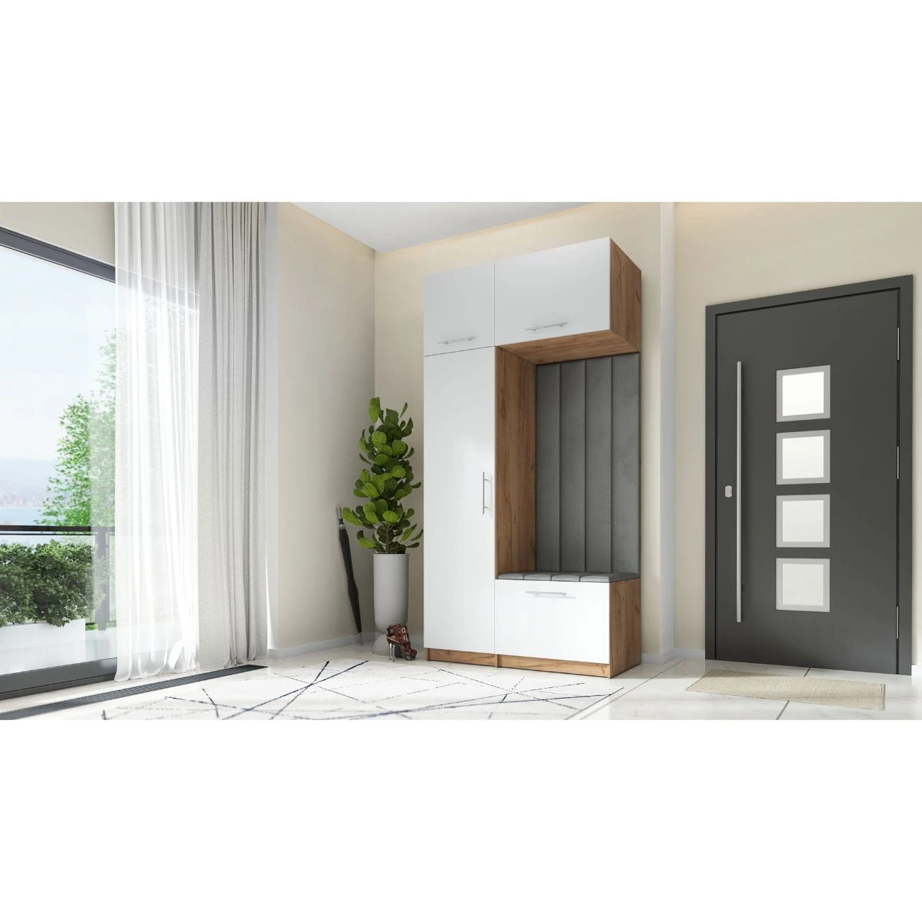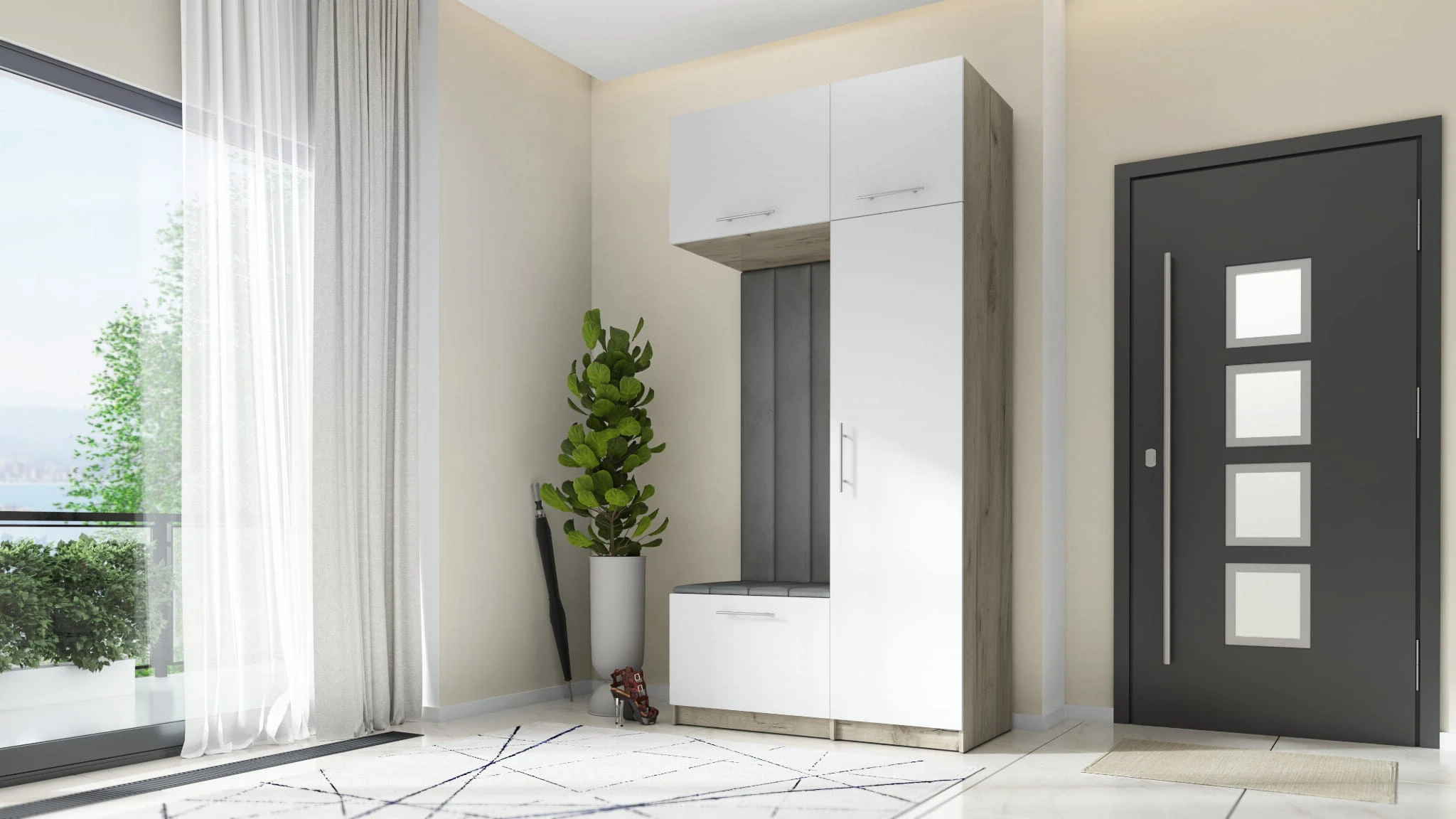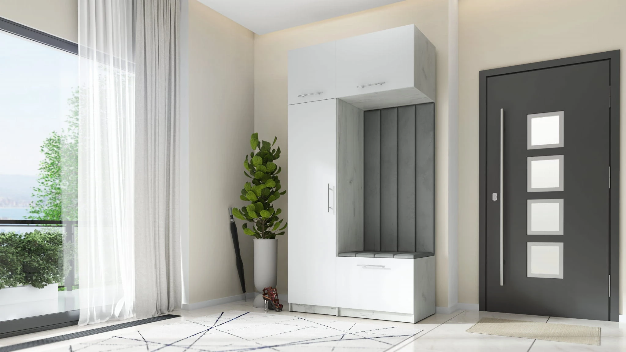 Nowoczesna garderoba do przedpokoju składana z dwóch części: po lewej stronie znajduje się jednodrzwiowa szafa z nadstawką. Za białym frontem wydostaje się drążek na wieszaki, który pomieści nawet najdłuższe płaszcze. Nadstawka posiada przód podnoszony do góry z siłownikami ułatwiającymi otwieranie nadstawki. Szeroka półka umożliwia przechowanie walizek podróżnych czy nawet pościeli.
