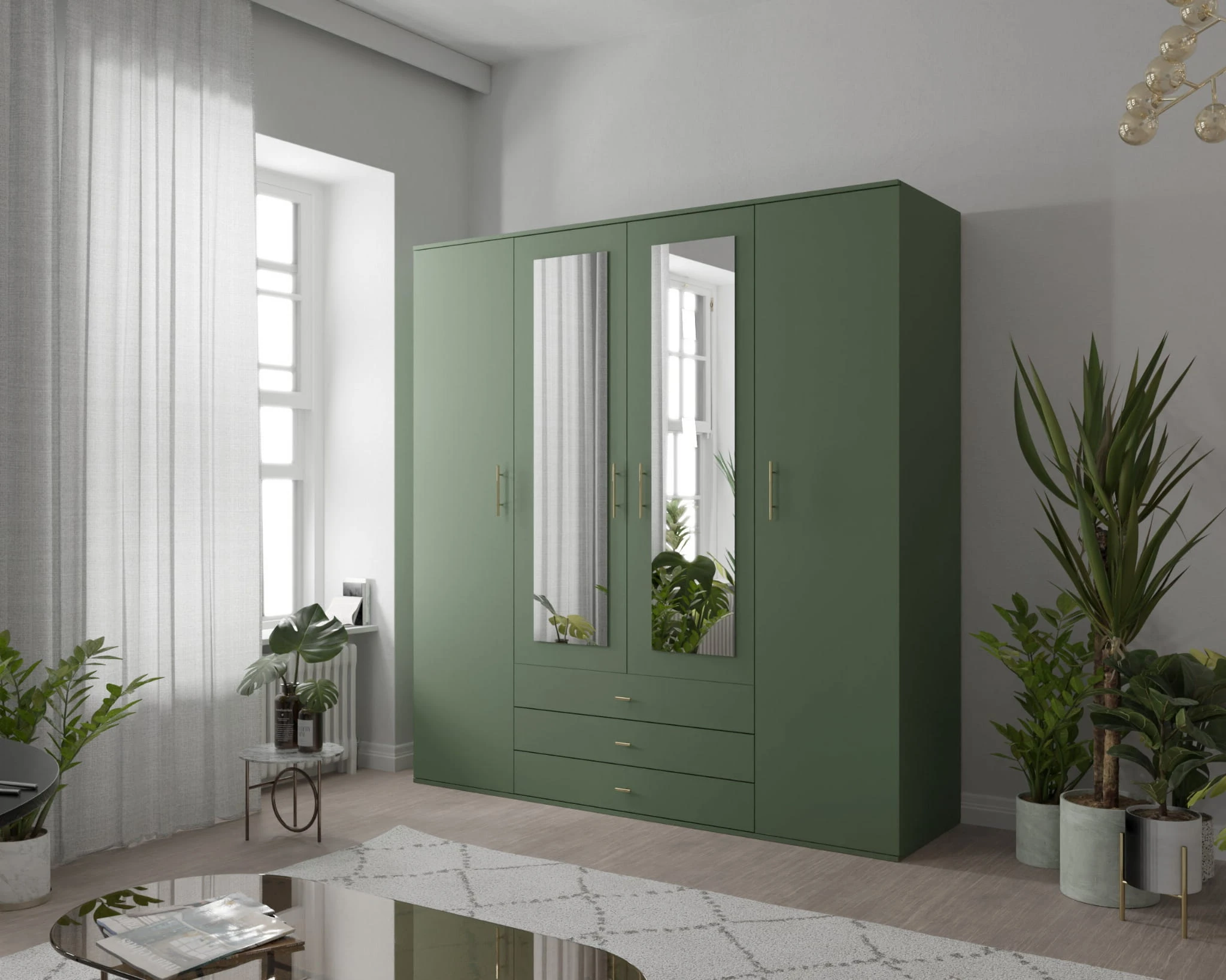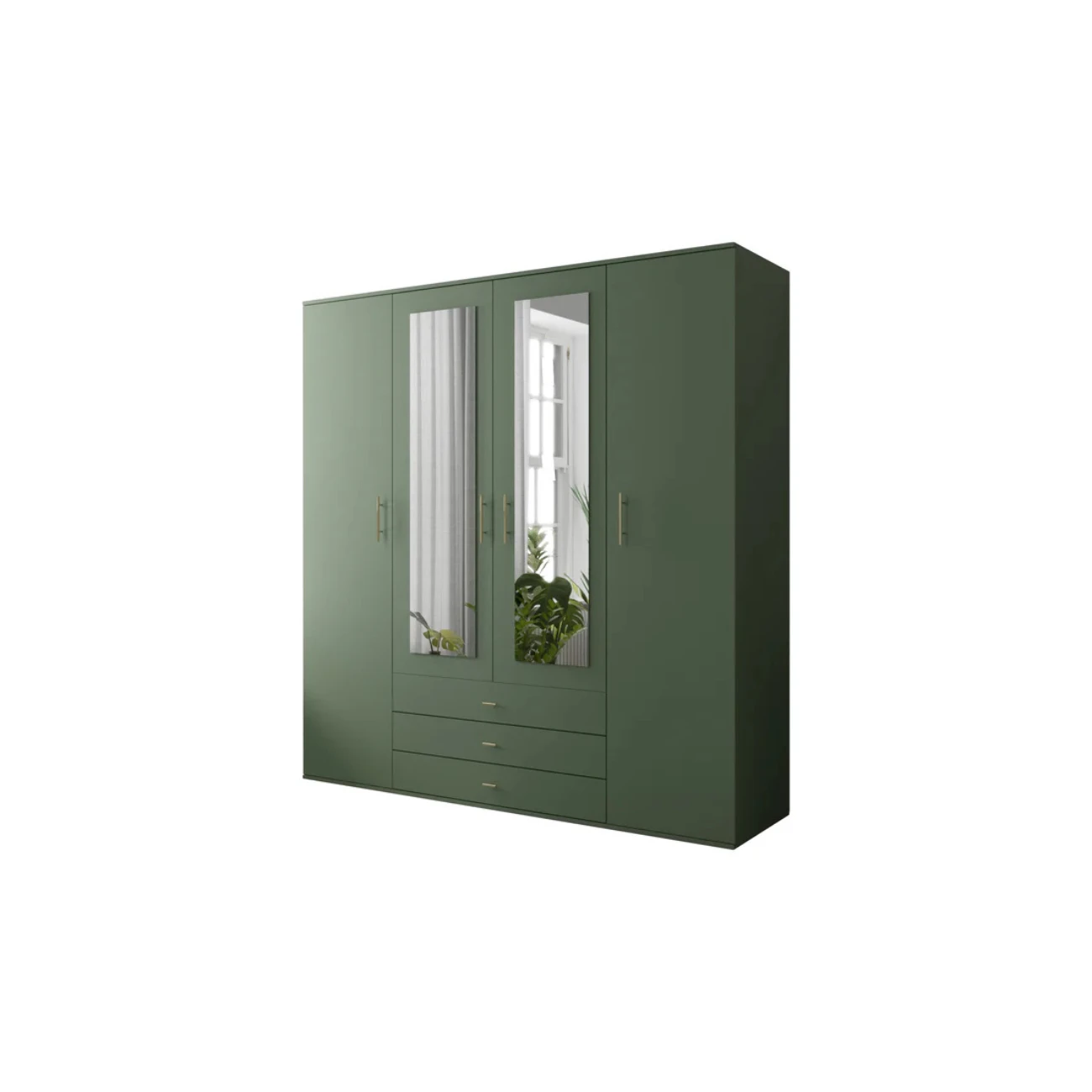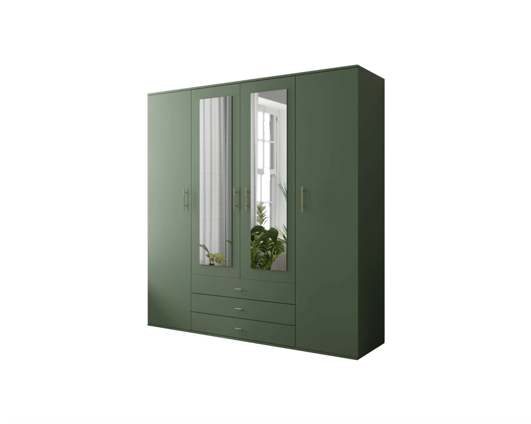 Czterodrzwiowa szafa Olga to mebel w klasycznej formie z dużym lustrem, trzema szufladami, półkami na ubrania oraz drążkiem na wieszaki. Kolor szafy z lustrem Olga sprawia jednak, że to mebel wobec, którego trudno przejść obojętnie. Niezwykły, głęboki, kojący odcień zielonego sprawia, że szafa staje się nietuzinkowa, a wręcz wyjątkowa.
