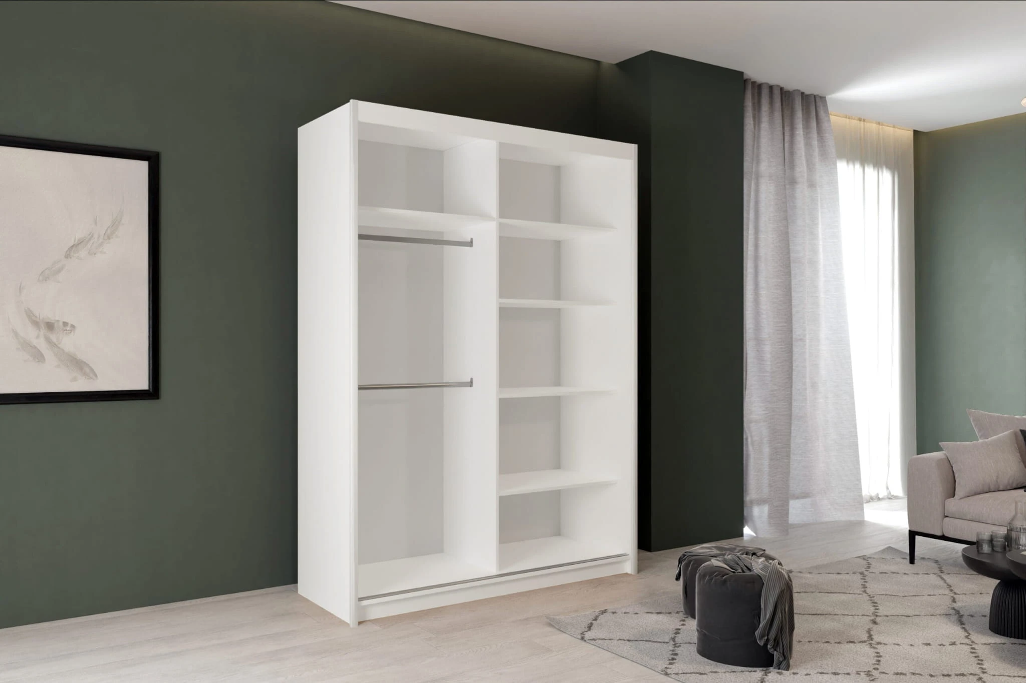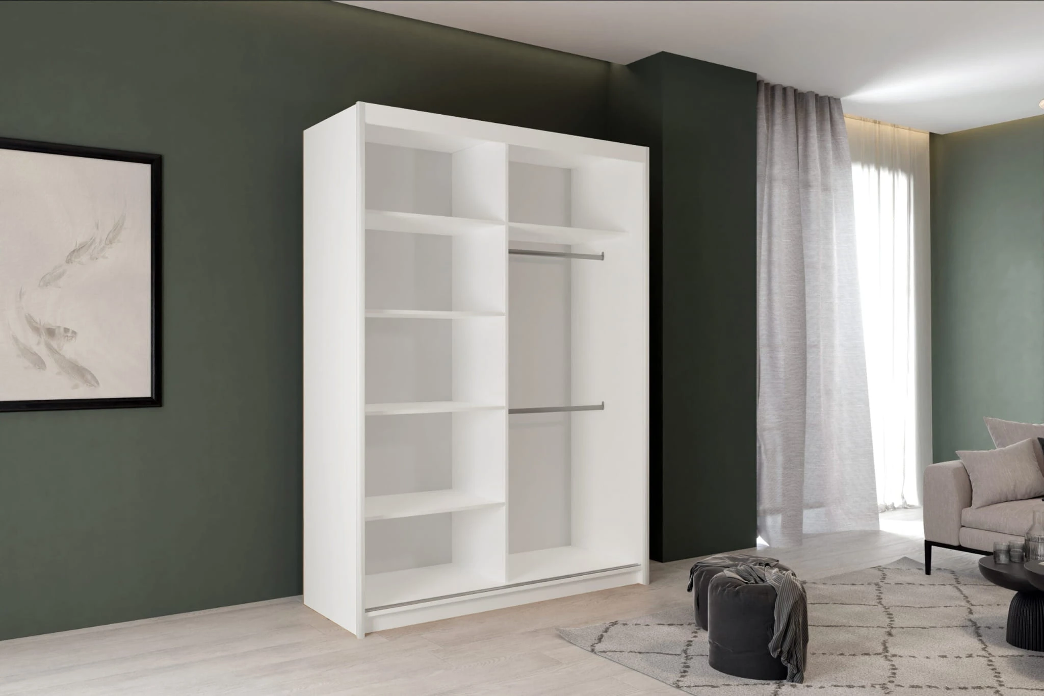 Szafa przesuwna z ozdobnymi lamelami Artist posada uniwersalny korpus, dzięki czemu możesz złożyć ją na wiele sposobów. Chcesz mieć drążki na wieszaki po lewo, a półki na obrania po prawo? Żaden problem. Na dole mają być półki, a górze drążki? Nie ma sprawy! Szafa do sypialni Artist dopasuje się do Twoich potrzeb!