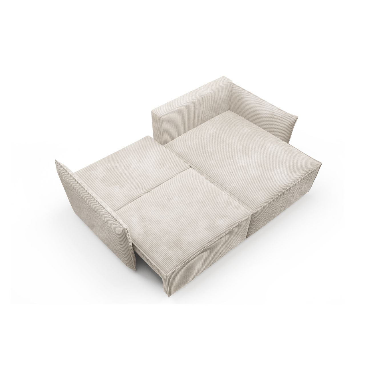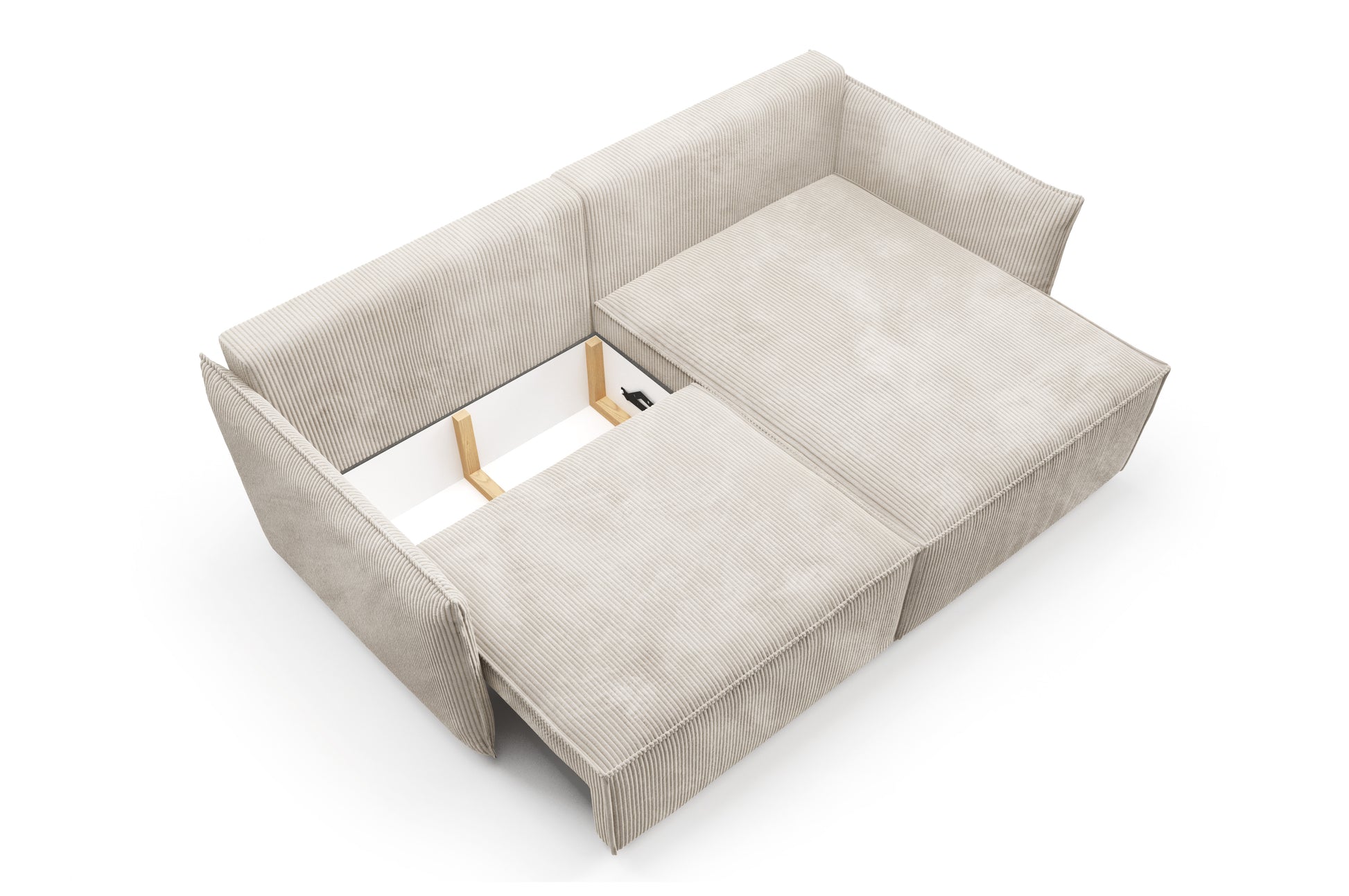 Sztruksowy narożnik posiada funkcję spania o powierzchni 135x204 cm. Dla Twojej wygodny narożnik został wyposażony w sprężyny faliste na całej powierzchni spania, a także automat ułatwiający rozłożenie rogówki oraz dostęp do pojemnika na pościel.