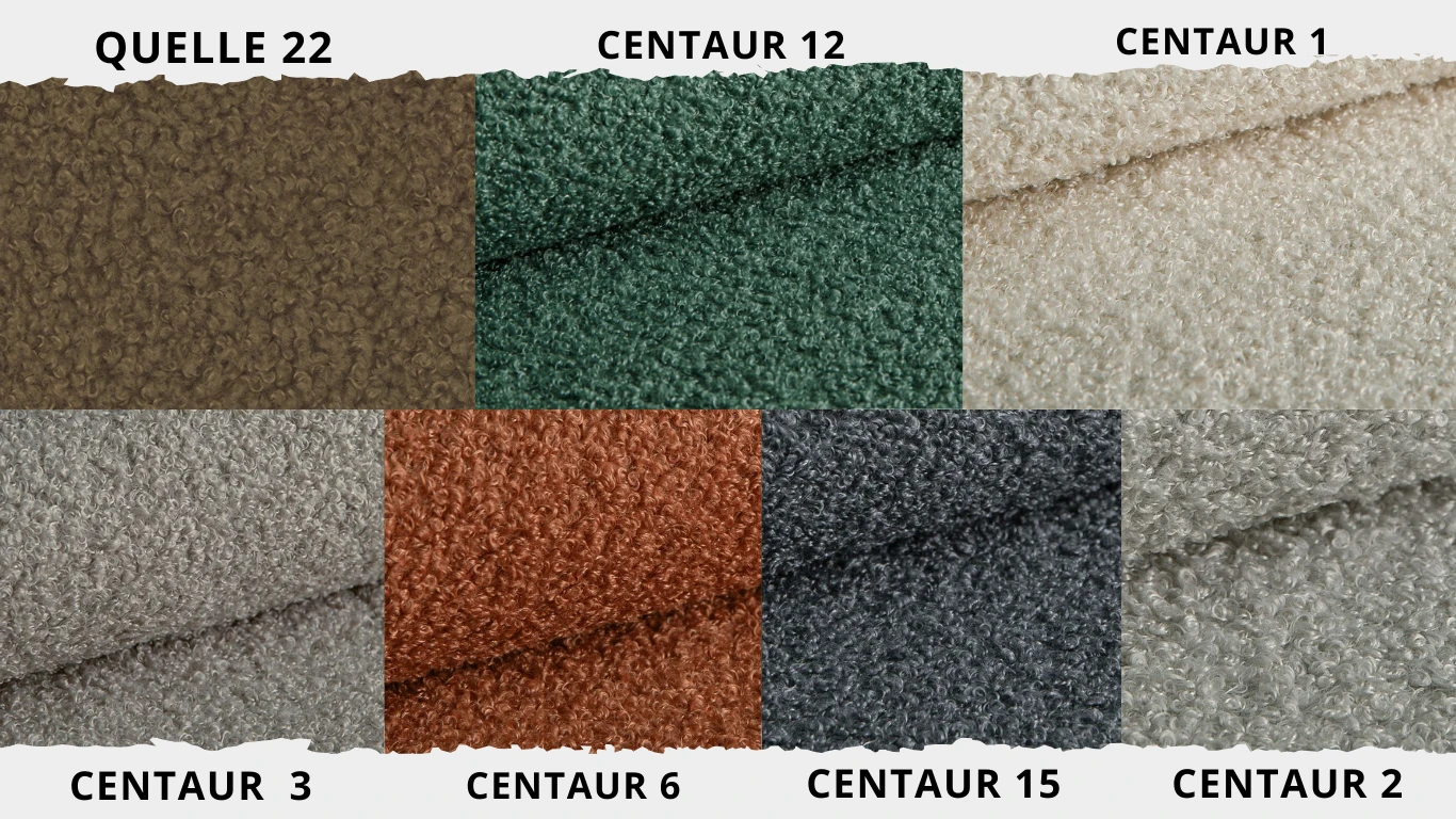 Centaur to wyjątkowa tkanina typu bouclé, która zachwyca swoją miękką, pętelkową strukturą i przytulnym charakterem. Jej wyraźna, trójwymiarowa faktura nadaje meblom głębi i ekskluzywnego wyglądu, jednocześnie wprowadzając do wnętrza ciepło i subtelną elegancję.