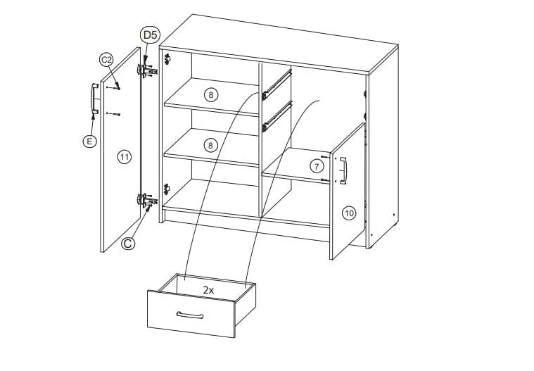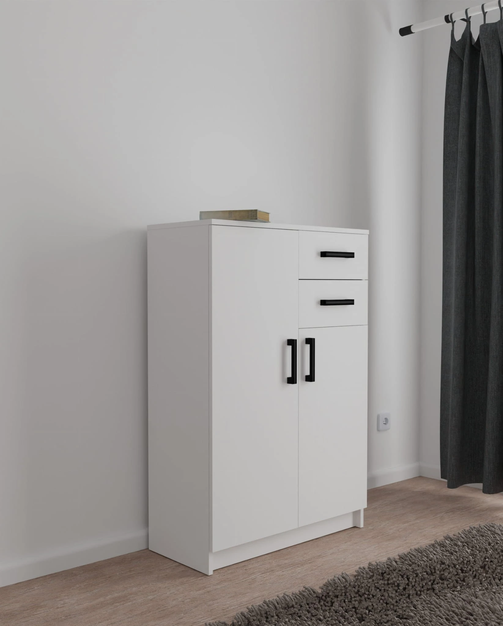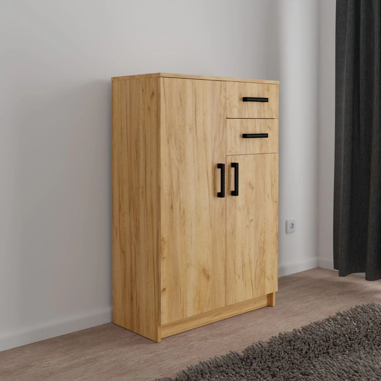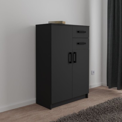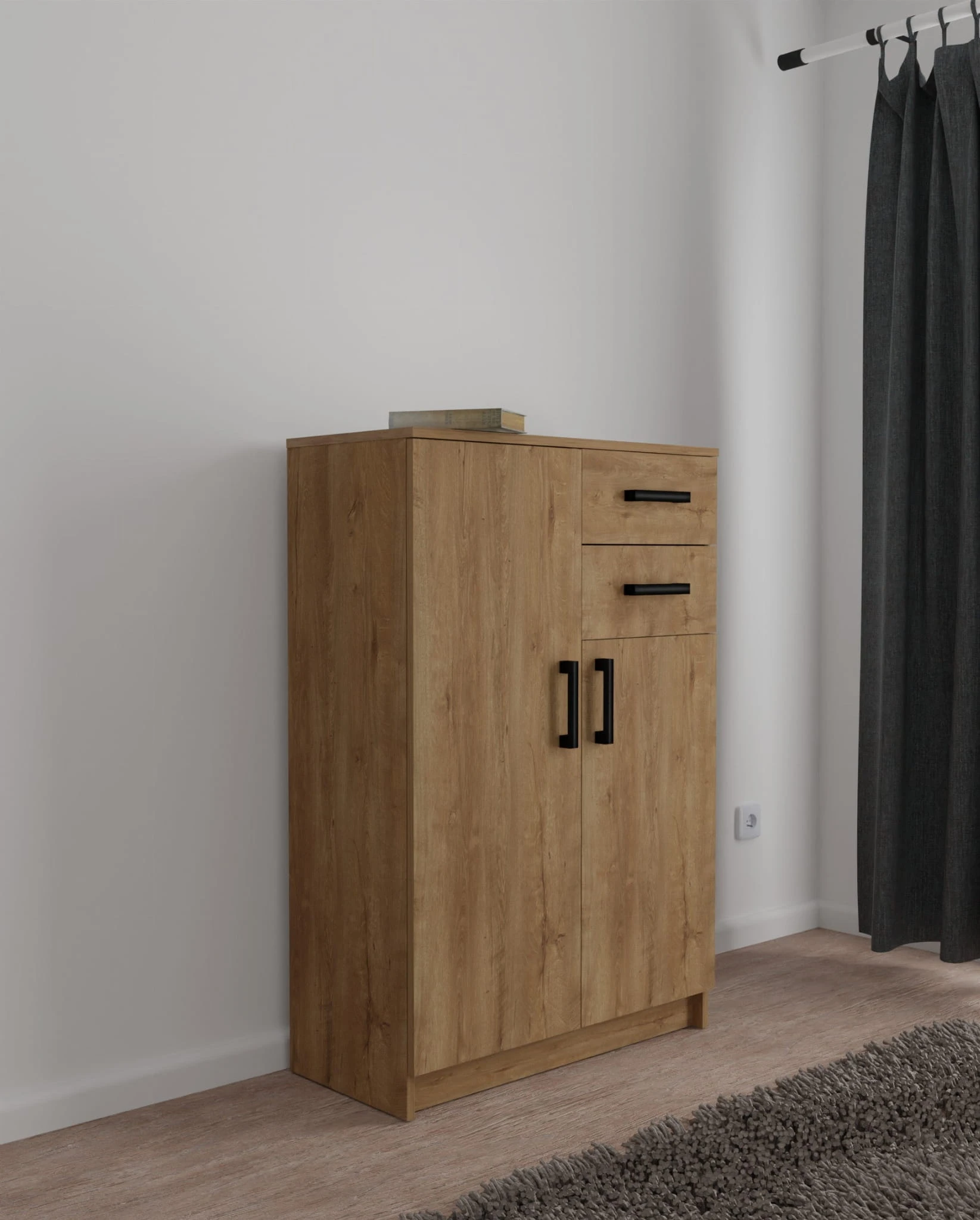 Po lewej stronie komody znajduje się duża szafka z dwoma półkami. W ten sposób otrzymujemy trzy miejsca do przechowywania przedmiotów.