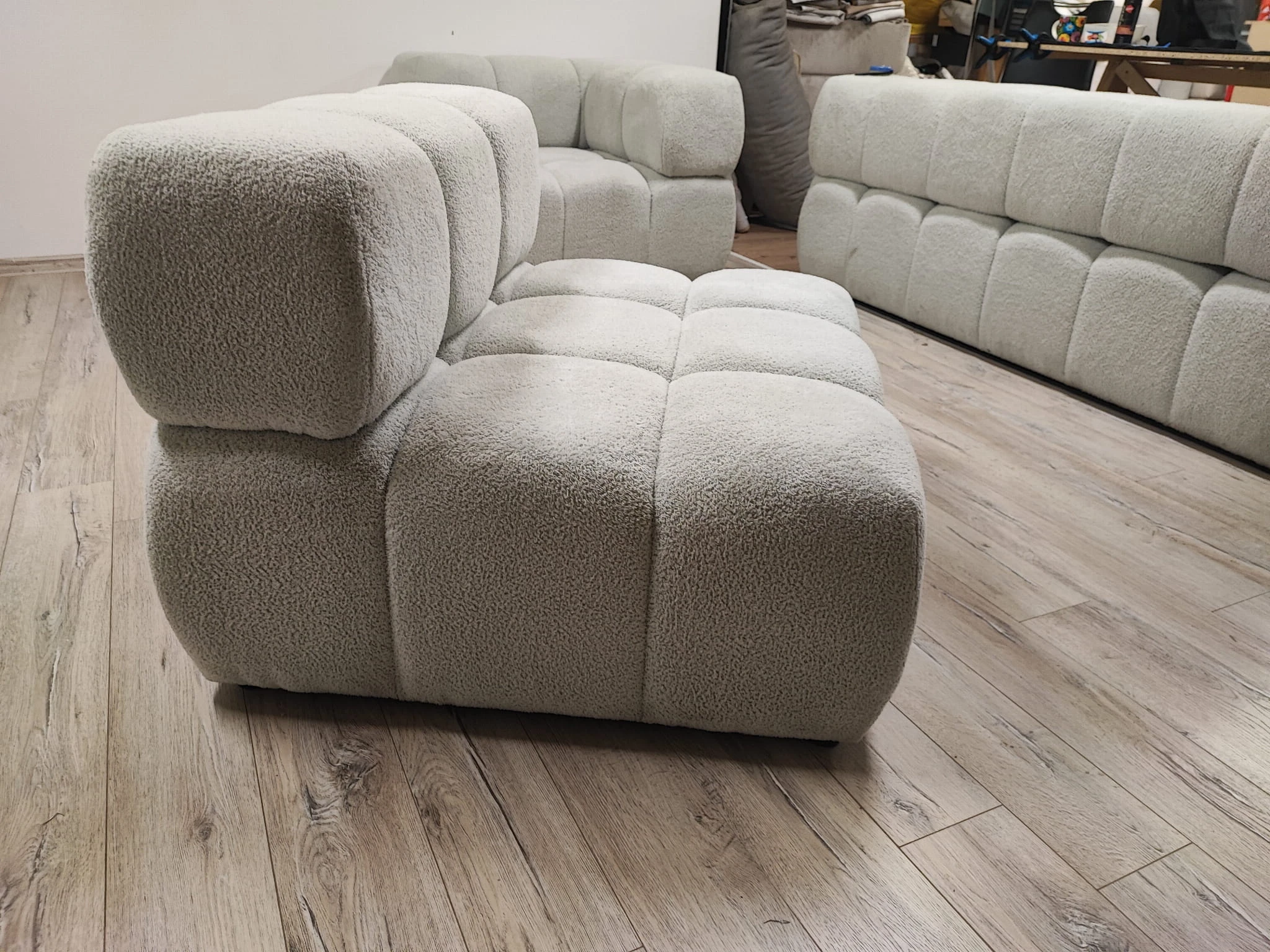 Kolekcja mebli modułowych do salonu Clixi została ubrana w niezwykle przyjemną w dotyku barankową tkaninę Frotte. To miękki, pokryty miłym włosiem materiał, który aż chce się mocno przytulić.